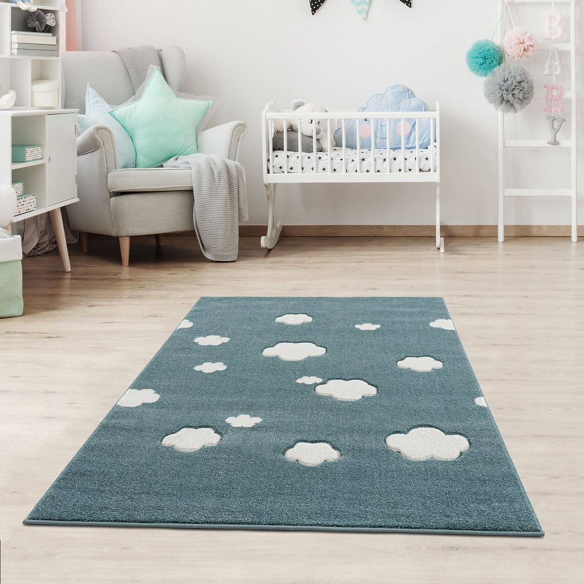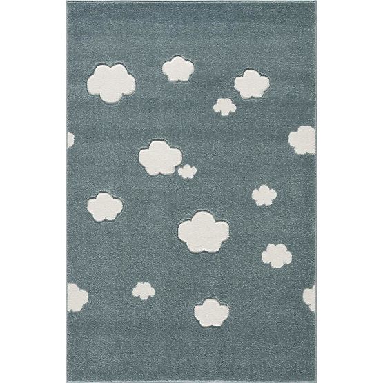 Luxuriöser grau-mintfarbener Teppich mit weißen Wolken der deutschen Firma LIVONE im Format 120x180 cm für Kinder oder Schülerzimmer.