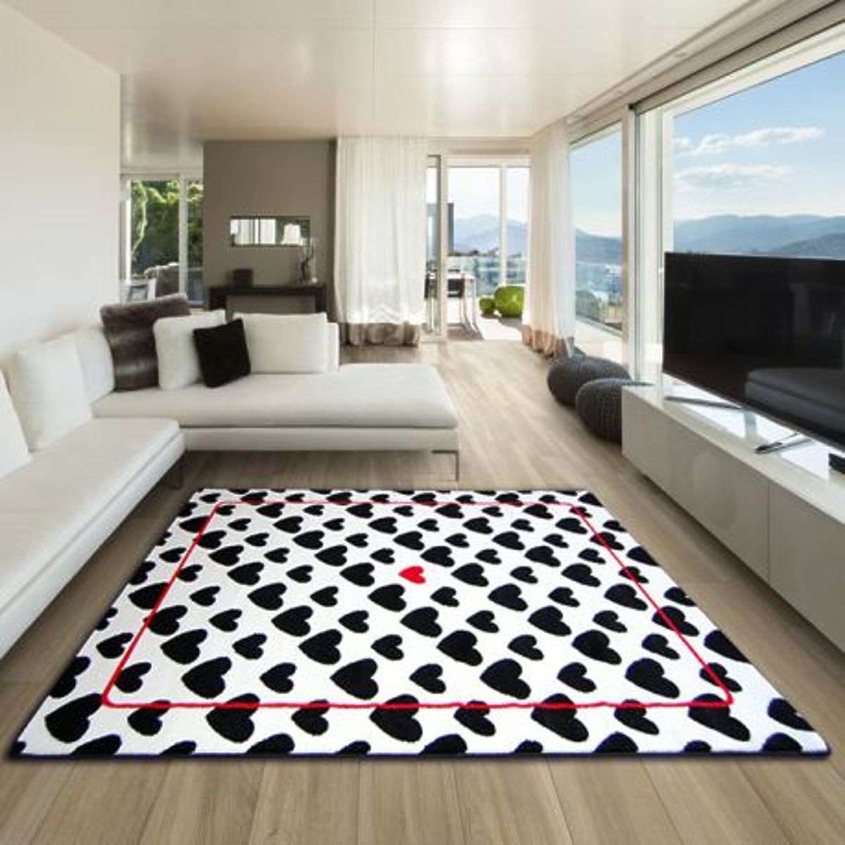 Moderner Teppich mit Herzdesign in Creme und Schwarz. .. mehr