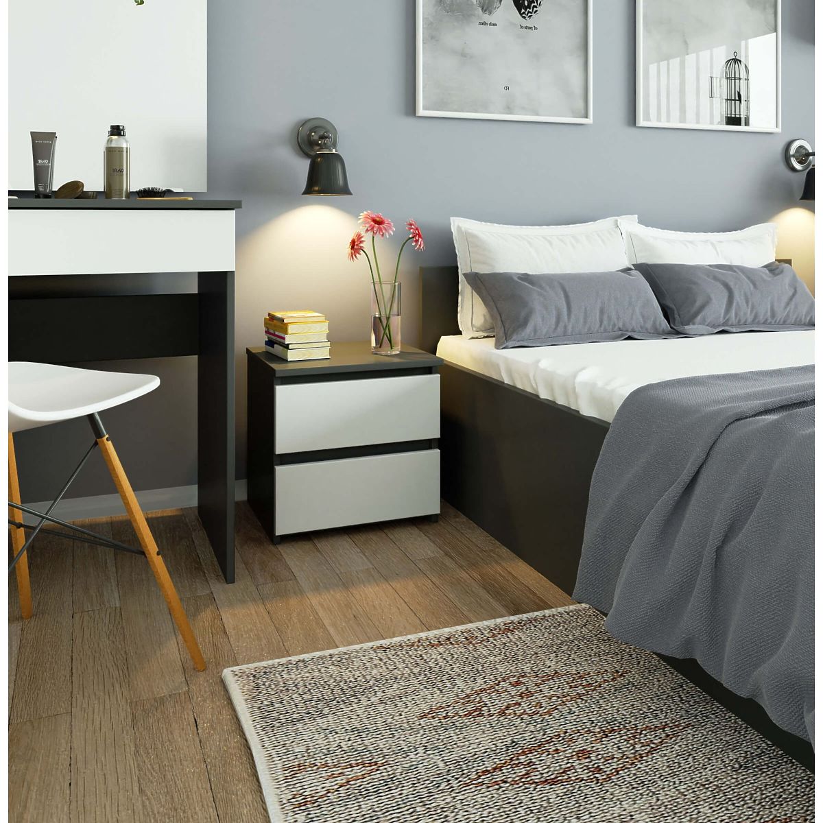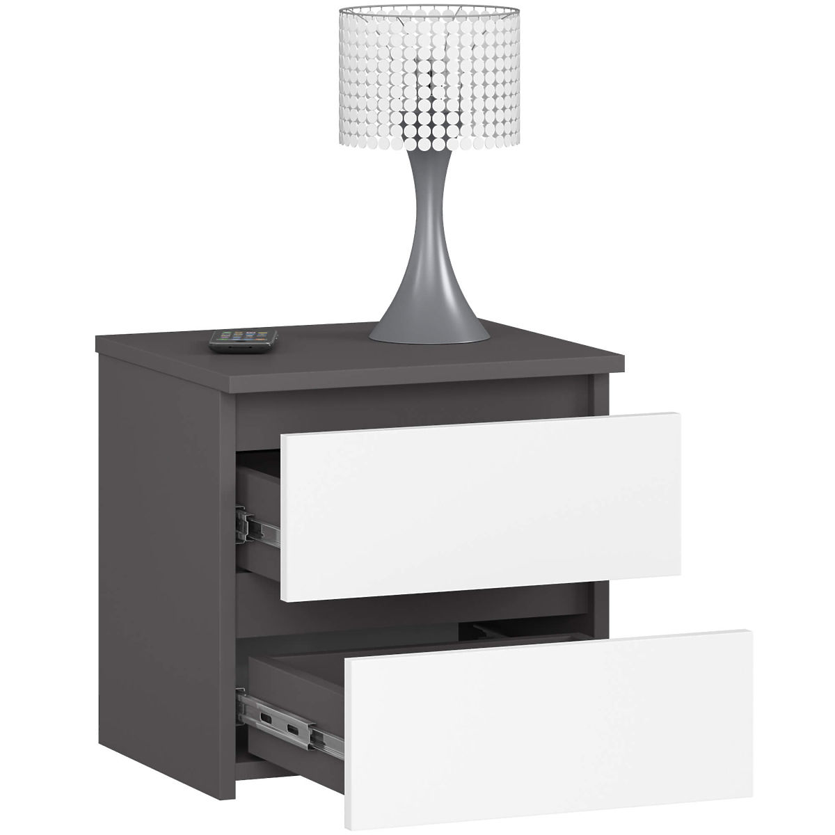 Nachttische sind eine beliebte Art von Möbeln, die neben dem Bett platziert werden. Auf seiner Platte kann eine Lampe aufgestellt werden, während in den Schubladen wichtige Gegenstände aufbewahrt werden können, die die Qualität von Ruhe und Schlaf verbessern. In unserem Angebot ist der Nachttisch CL2 40 cm in der Farbe Grafit Grau mit weißen Fronten erhältlich. Er wirkt elegant und modern und ist gleichzeitig funktional. Er passt perfekt in jedes Schlafzimmer und Jugendzimmer.