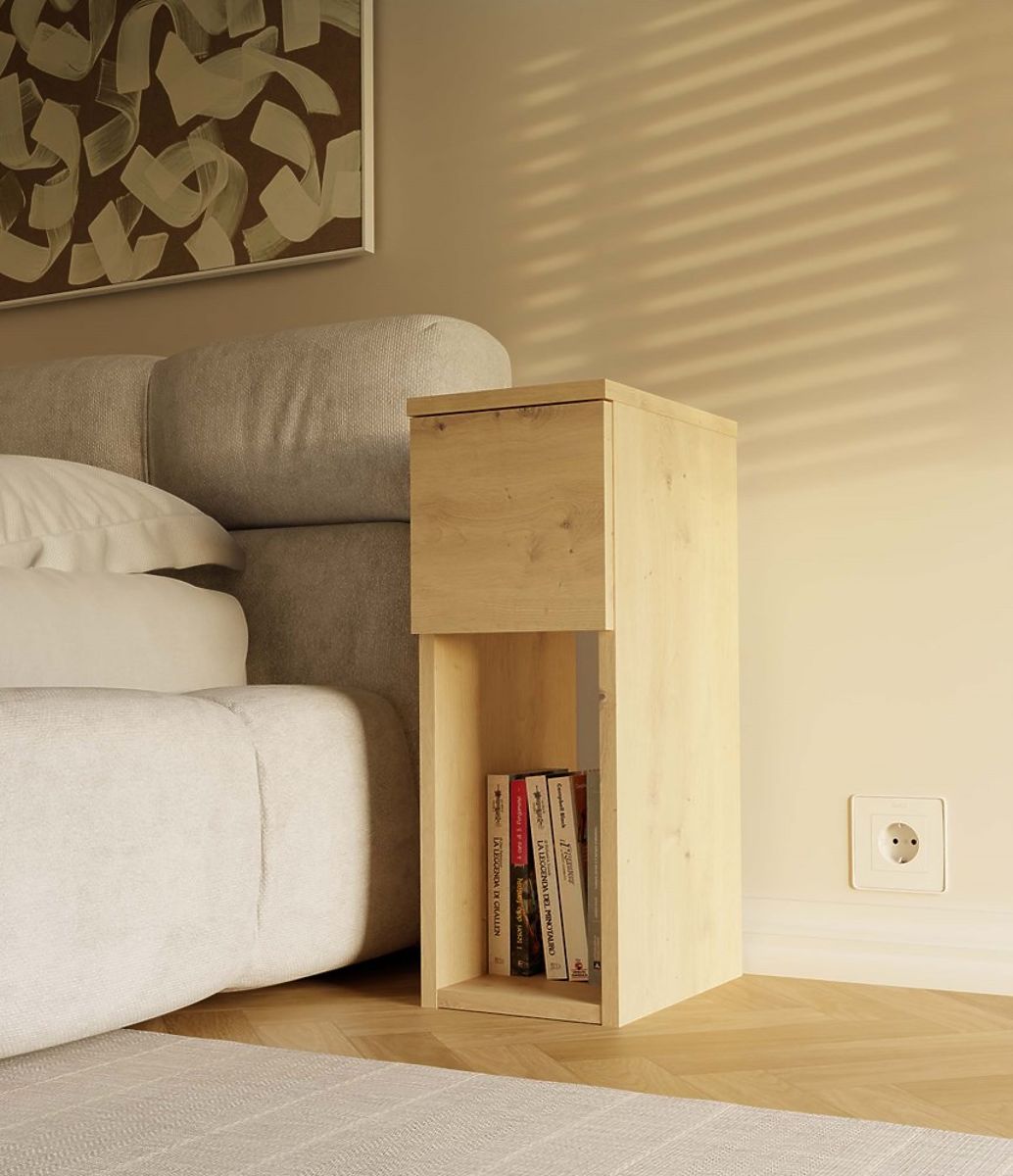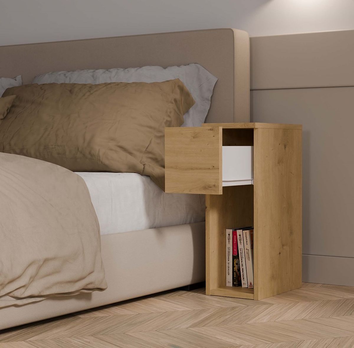 Der Nachttisch GALAX 20 1S ist eine praktische und ästhetische Ergänzung für jedes Schlafzimmer. Ausgestattet mit einem offenen Regal und einer Schublade, eignet er sich hervorragend als Platz für Buch, Telefon, Ladegerät oder andere Gegenstände, die Sie immer griffbereit haben möchten.