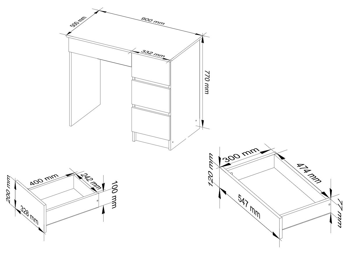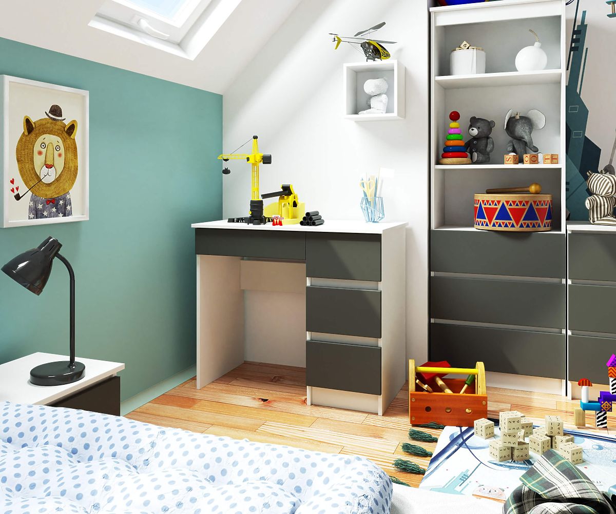 Der Computertisch A-7 ist ein kleines Möbelstück, das in einem kleinen Raum - Büro oder Wohnbereich - seinen Platz findet. Er eignet sich zum Beispiel für das Homeoffice oder das Kinder-/Jugendzimmer. Das präsentierte Produkt kombiniert zwei kontrastierende, aber hervorragend ergänzende Farben - grafitgrau und weiß. Es besteht aus drei Schubladen, die beliebig angeordnet werden können. Ein einfaches, aber äußerst funktionales Möbelstück, das sicherlich diejenigen zu schätzen wissen, die einen Arbeits- oder Lernbereich schaffen möchten, aber nicht viel Platz zur Verfügung haben.