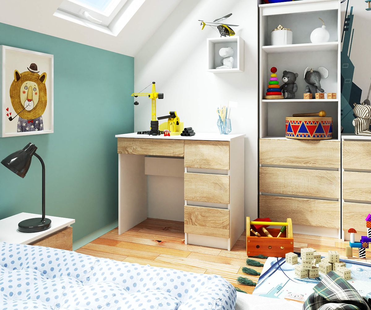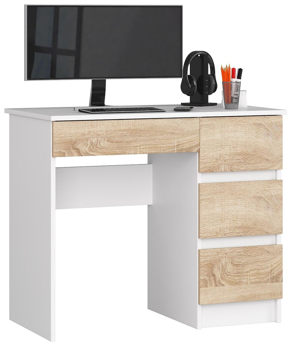 Computertische gehören zu den am häufigsten gesuchten Möbelstücken. Kein Wunder, wenn wir so viel Zeit vor dem Computerbildschirm verbringen. Es ist daher gut, sich zu Hause eine Ecke zum Lernen oder Arbeiten einzurichten. Der Computertisch A-7 70 cm in Weiß mit Frontflächen in Sonoma-Farbe kann dabei helfen. Es handelt sich um ein funktionales und modernes Möbelstück, das sich hervorragend für das Wohnzimmer, das Kinderzimmer und das Büro eignet.