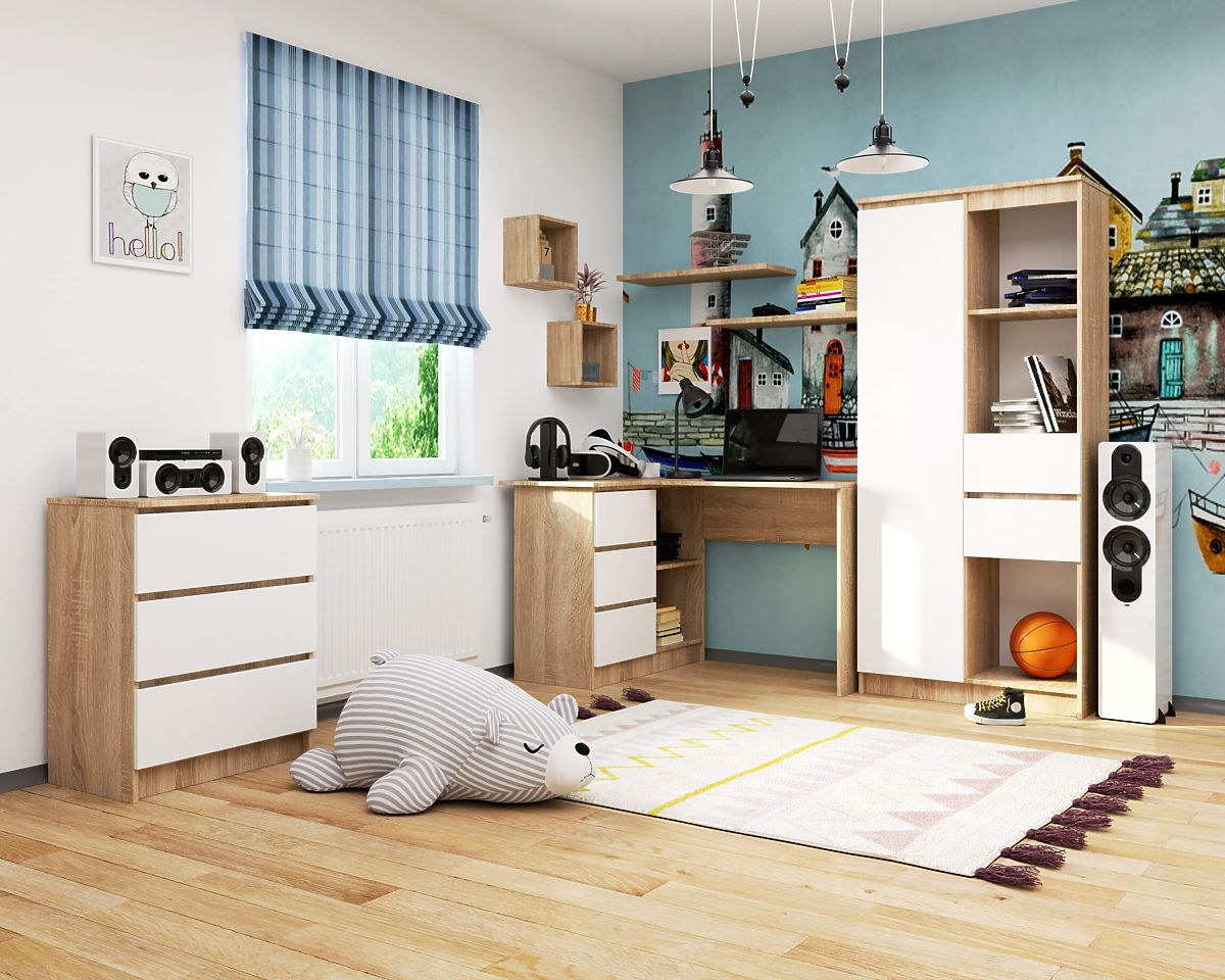 Der Eckschreibtisch mit drei Schubladen ist ein interessantes Angebot für diejenigen, die moderne Büroeinrichtungen bevorzugen. Es ist eine subtile Kombination aus klassischem Weiß und der sehr modischen Farbe Eiche Sonoma. Das Möbelstück besteht aus einem Schreibtisch, zwei offenen Schränken und Schubladen. Das präsentierte Angebot passt gut in jedes Büro, wo eine möglichst funktionale Raumnutzung wichtig ist. Zur Herstellung wurde eine 16 Millimeter dicke laminierte Platte verwendet - ein widerstandsfähiges Material mit hoher Beständigkeit gegen Beschädigungen. Der Eckcomputertisch wird sicherlich auch die anspruchsvollsten Kunden zufriedenstellen, denen sowohl das Aussehen als auch die Qualität und Funktionalität wichtig sind. Wir laden Sie auch ein, weitere Möbel aus dieser Kollektion kennenzulernen - Kommoden, Regale und Schränke, die in der gleichen Farbkombination erhältlich sind. Mit ihnen gelingt es sicherlich, einen geeigneten Raum für Büroarbeit oder Studium zu schaffen - sowohl zu Hause als auch im Büro.