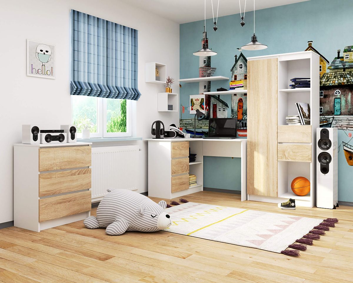 Wie wählt man einen Tisch für das Jugendzimmer aus? Vor allem nach Funktionalität. Das Zimmer eines Teenagers muss viele verschiedene Funktionen erfüllen und sowohl Platz zum Lernen als auch zum Spielen bieten. Der Eckcomputertisch, den wir Ihnen hier vorstellen, ist ein modernes Design, das speziell auf die Bedürfnisse junger Menschen zugeschnitten ist. Er zeichnet sich durch eine stabile Konstruktion und eine hochwertige laminierte Platte aus, die bei der Herstellung verwendet wird. Sie ist langlebig und kratzfest. Der leicht zu reinigende Tisch besticht zudem durch ein interessantes Aussehen, das Teenagern sicherlich gefallen wird. Das Angebot ist zu einem wettbewerbsfähigen Preis erhältlich. Das präsentierte Produkt passt hervorragend nicht nur in ein Jugendzimmer, sondern auch in ein Kinderzimmer oder ein Homeoffice. Es kann auch im Büro verwendet werden, wo es durch seine praktische Nutzung, den großen Raum für individuelle Gestaltung und das universelle und zeitlose Design überzeugt. Wir laden Sie zum Kauf ein.