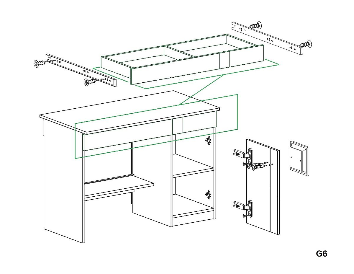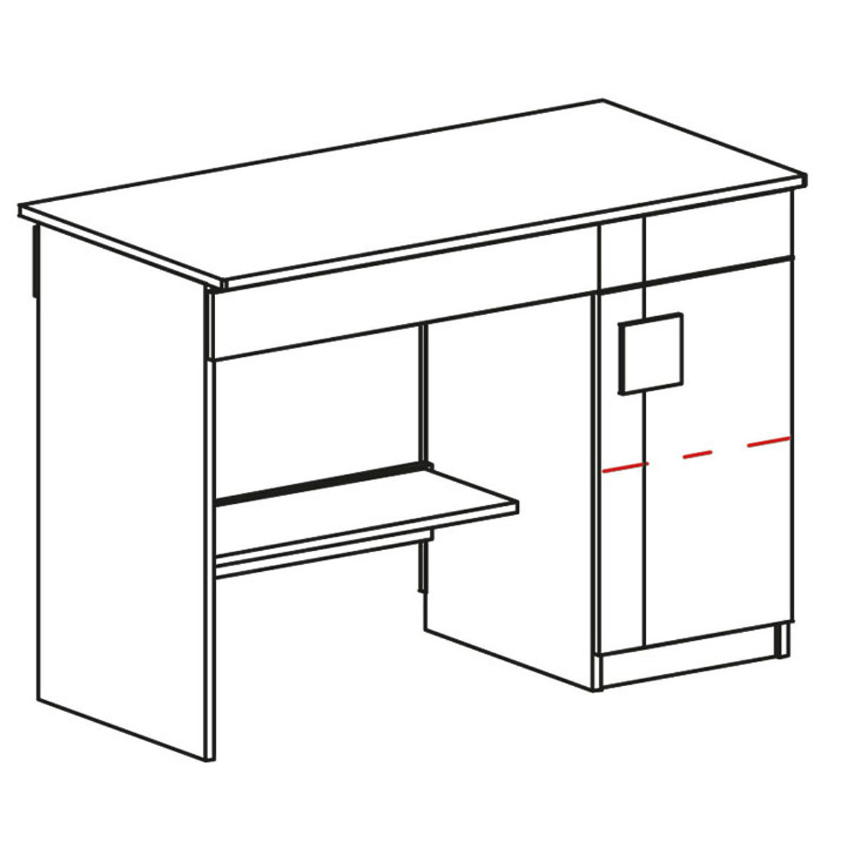 Zusätzlicher Stauraum befindet sich hinter der Tür mit einem Griff. Im Schrank befindet sich ein Regal. Im unteren Teil des Tisches befindet sich ein "luftiges Regal".