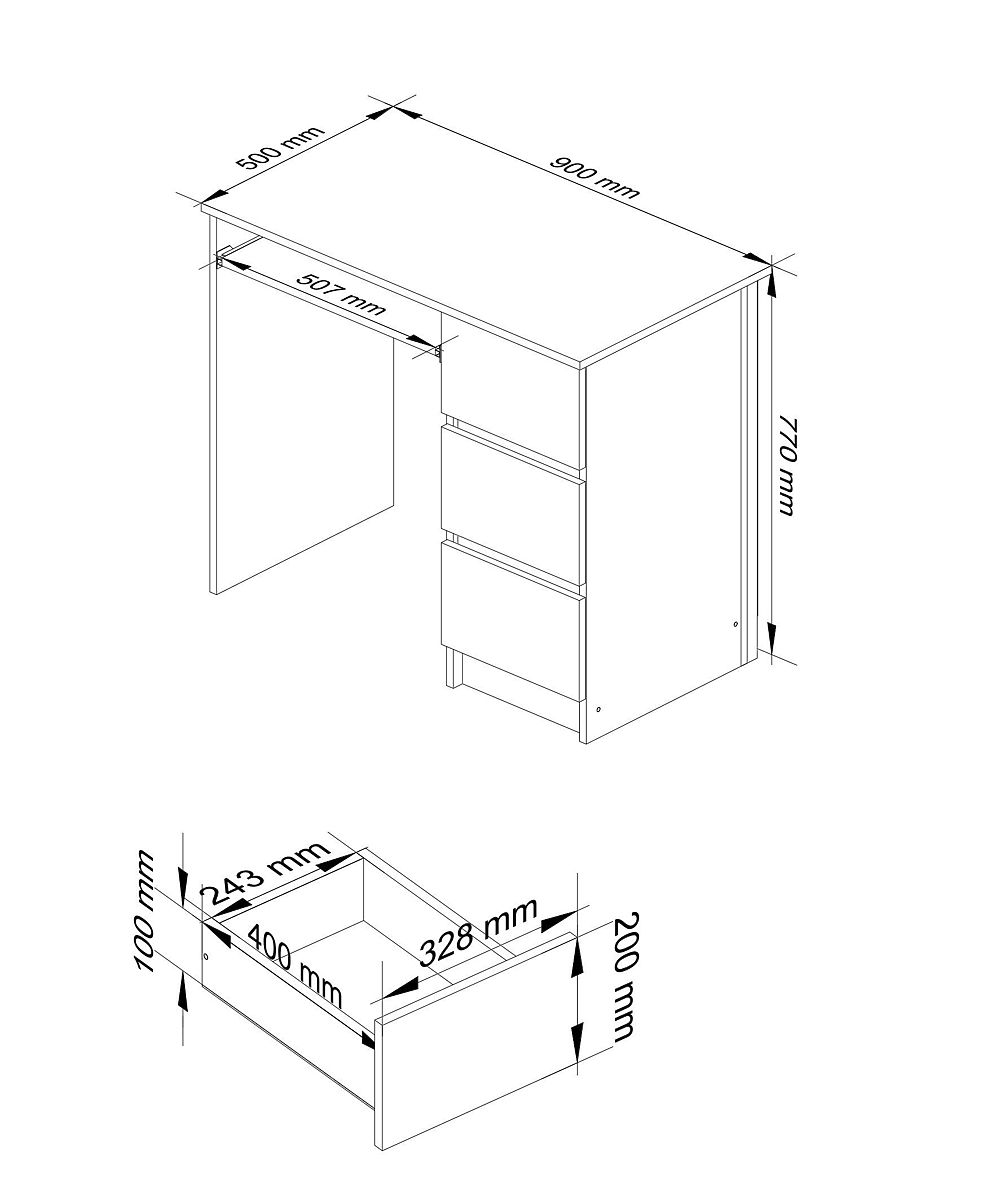 Der Schreibtisch aus laminiertem Holz ist ein Produkt, das sich durch hohe Abriebfestigkeit auszeichnet, wodurch er lange in perfektem Zustand bleibt. Sein universelles Aussehen sorgt dafür, dass er in jeden Raum passt. Das Möbelstück ist mit einer Platte, einem ausziehbaren Regal und drei geräumigen Schubladen ausgestattet, die individuell angeordnet werden können.