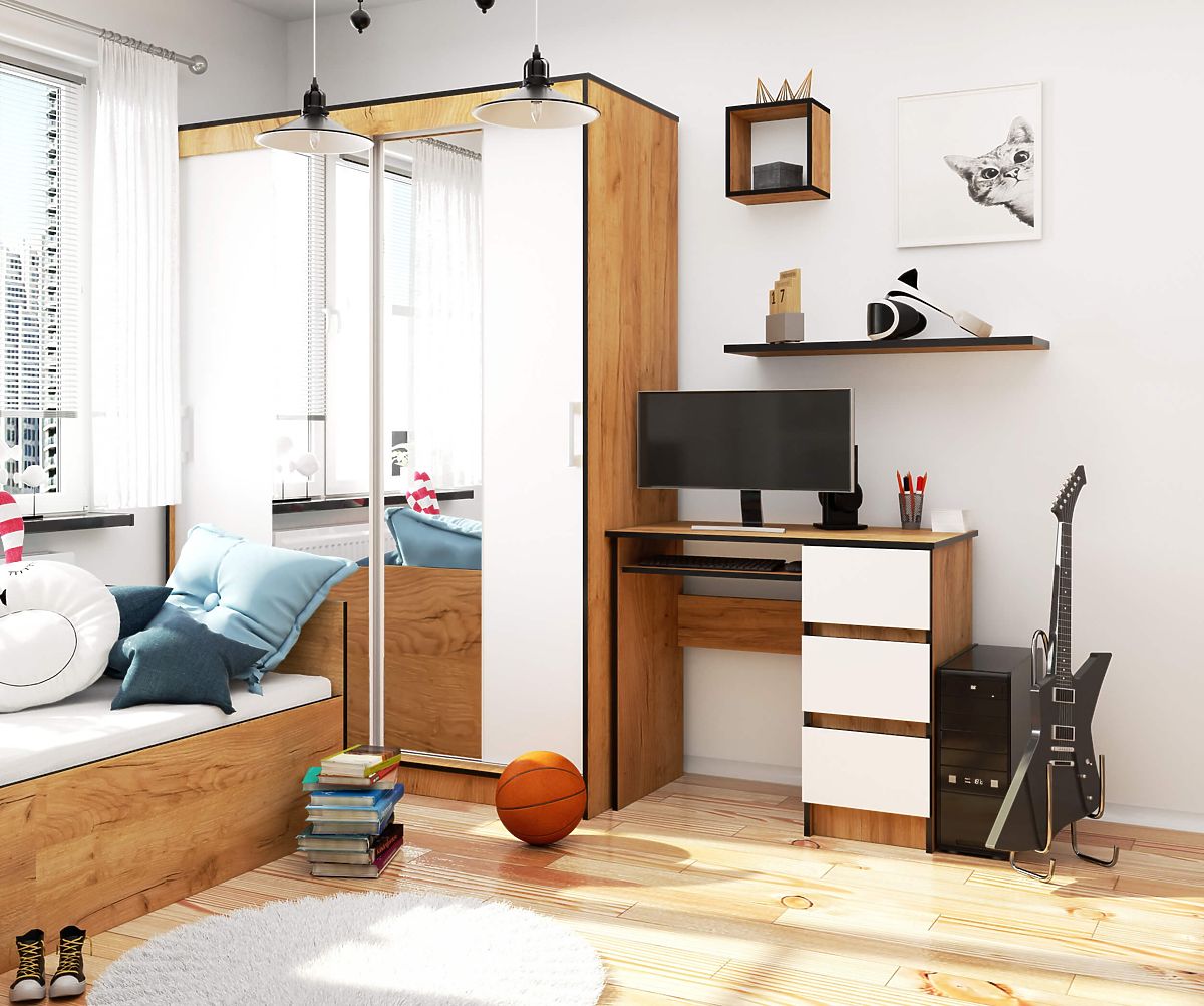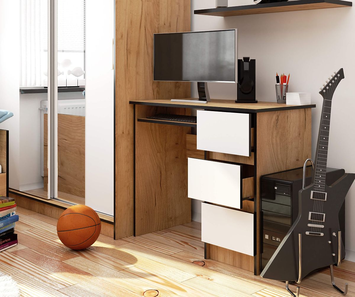 Der Schreibtisch A-6 mit einer Länge von 90 cm in der Farbe Eiche Craft mit weißen Fronten passt dank seines universellen und zeitlosen Designs perfekt in klassische und moderne Kinder- oder Jugendzimmer. Er kann auch erfolgreich als Teil der Ausstattung eines Home-Office genutzt werden. Alles hängt von den individuellen Bedürfnissen und Vorlieben des Nutzers ab. Dank der drei praktischen Schubladen erhalten Sie zusätzlichen Stauraum für verschiedene Dinge, die Sie griffbereit haben möchten.
