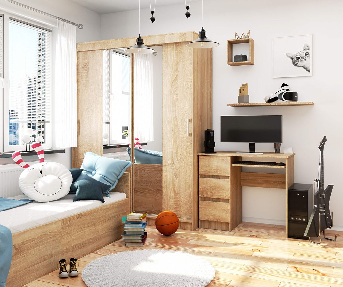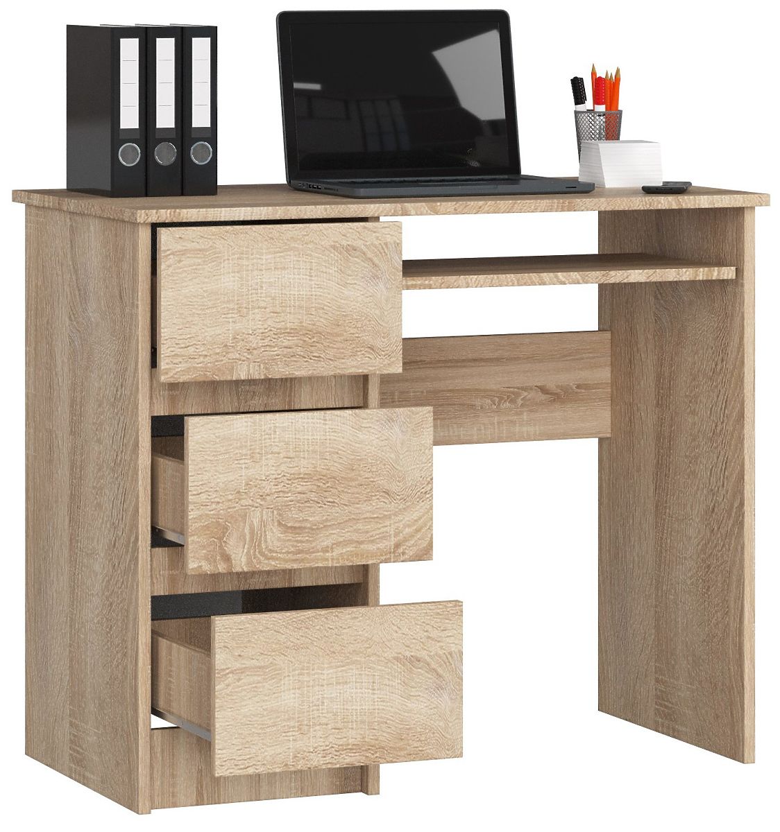 Für diejenigen, die einen funktionalen Schreibtisch in kleinerer Größe suchen, könnte unser Angebot interessant sein. Der präsentierte Computertisch A-6 SONOMA links hat eine Länge von 90 cm, eine Höhe von 77 cm und eine Tiefe von 50 cm und wiegt 30 kg. Das Material ist eine hochwertige laminierte Platte, die das Produkt abriebfest macht. Die sichtbaren Kanten des Tisches sind mit einer ABS-Kante versehen, was sicherstellt, dass das Möbelstück nicht leicht beschädigt wird. Der Tisch bietet auch viel freien Raum, der nach Belieben organisiert und genutzt werden kann. Dies alles dank der drei Schubladen - in jeder von ihnen befindet sich ein Regal. Der Tisch enthält auch ein Tastaturregal, das sich leicht und frei bewegen lässt. Dies ist dank der Metallrollenführungen möglich.