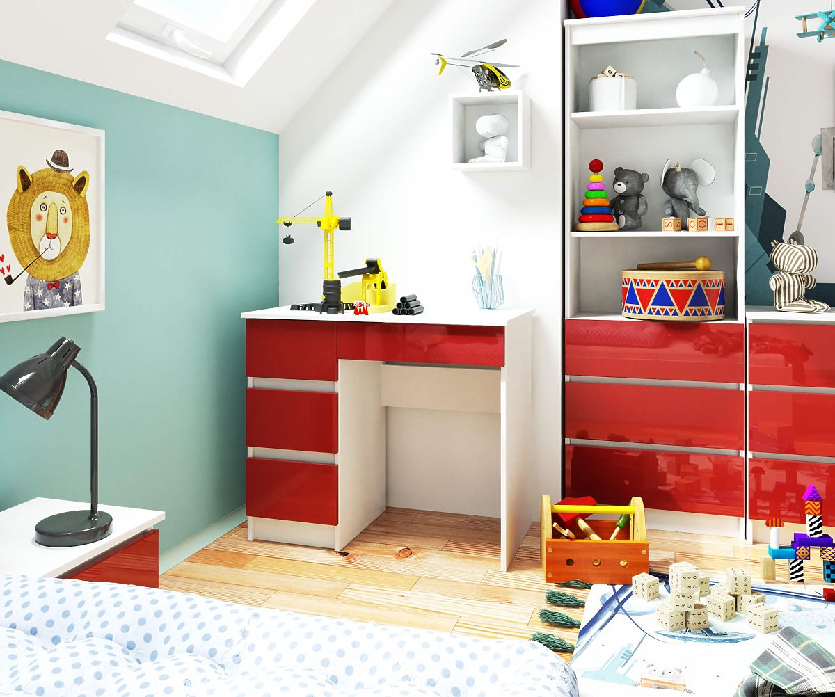 Die ungewöhnliche Farbe des Tisches zieht Aufmerksamkeit auf sich, und seine Funktionalität stellt sicher, dass dieses Produkt auch die Erwartungen der anspruchsvollsten Nutzer erfüllt. Das Möbelstück kombiniert einen weißen Korpus mit effektvollen roten Hochglanz-Fronten, die den Tisch außergewöhnlich machen. Es ist eine geeignete Wahl für kleine Räume dank der kompakten Abmessungen der Konstruktion. Der Computertisch A-7 90 cm (links) besteht aus vier Schubladen. Er findet vor allem in Kinder- und Jugendzimmern, aber auch in modern eingerichteten Büros Anwendung.
