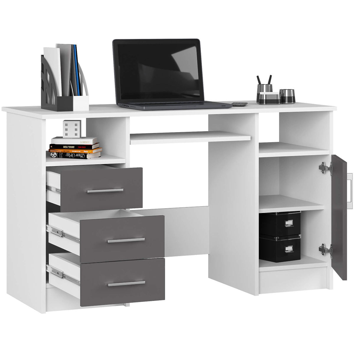 Der Computertisch ANA 124 cm fügt sich dank der klassischen Kombination aus Weiß und Graphitgrau leicht in jedes Interieur ein. Er wurde mit Blick auf Büro- und Arbeitsräume entworfen. Er passt auch in das Zimmer eines Teenagers. Auf der Tischplatte ist viel Platz – Sie können einen Monitor und andere notwendige Arbeitsgegenstände darauf platzieren. Für die Tastatur gibt es eine separate ausziehbare Ablage. Der Tisch bietet viel Raum für individuelle Anordnung: zwei Nischen, drei Schubladen und ein Schrank mit Regal. Die gesamte Konstruktion besteht aus laminiertem Plattenmaterial, das pflegeleicht und abriebfest ist. Der Tisch ANA vereint Eleganz, Funktionalität und Solidität.