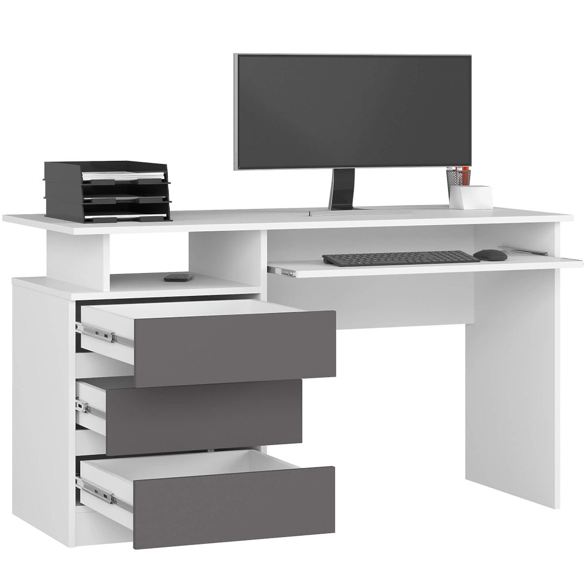 Schreibtisch mit weißem Korpus und graphitgrauen Fronten, 135 cm breit. .. mehr