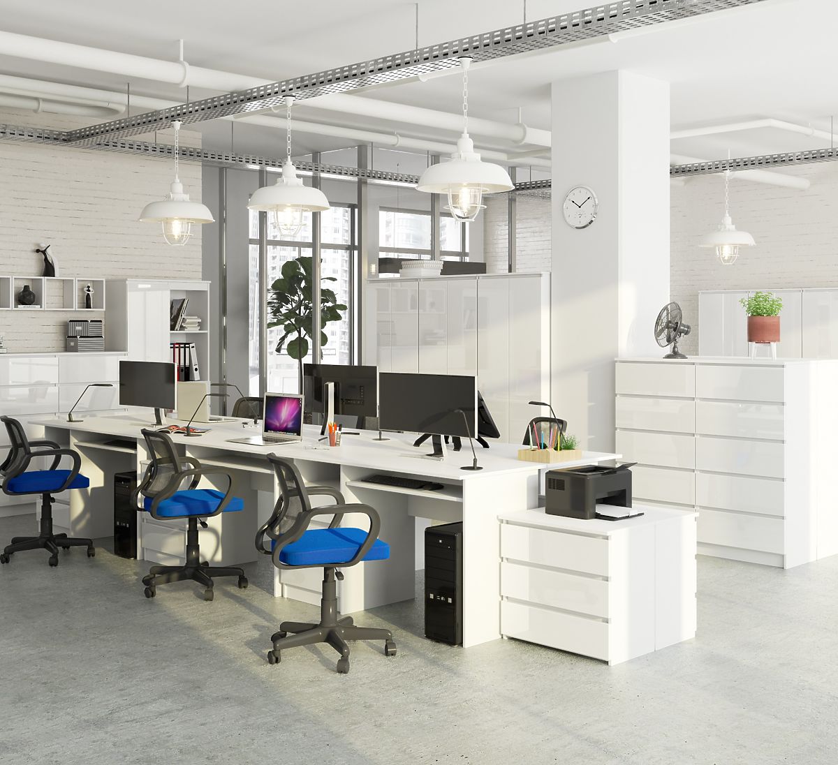 Das Möbelstück besteht aus einer 16 Millimeter dicken laminierten Platte, die langlebig und abriebfest ist. Die sichtbaren Kanten des Tisches sind mit einer ABS-Kante versehen, die ebenfalls eine hohe Widerstandsfähigkeit gegen Beschädigungen aufweist. Der matte Korpus harmoniert hervorragend mit den hochglänzenden Acrylfronten. Wenn Sie nach einer Lösung mit großer Arbeitsfläche und praktischen Schubladen suchen, empfehlen wir Ihnen, sich unser Angebot anzusehen. Wir garantieren höchste Qualität, Funktionalität, modernes Design und einen günstigen Preis. Zum Schreibtisch können Sie weitere Büromöbel aus unserem Online-Shop anpassen. Wir hoffen, dass er die Erwartungen selbst der anspruchsvollsten Kunden erfüllt. Der Tisch ist leicht zu reinigen und seine einfache und dennoch elegante Form macht das Möbelstück zeitlos und universell. Wir laden Sie zum Kauf ein.