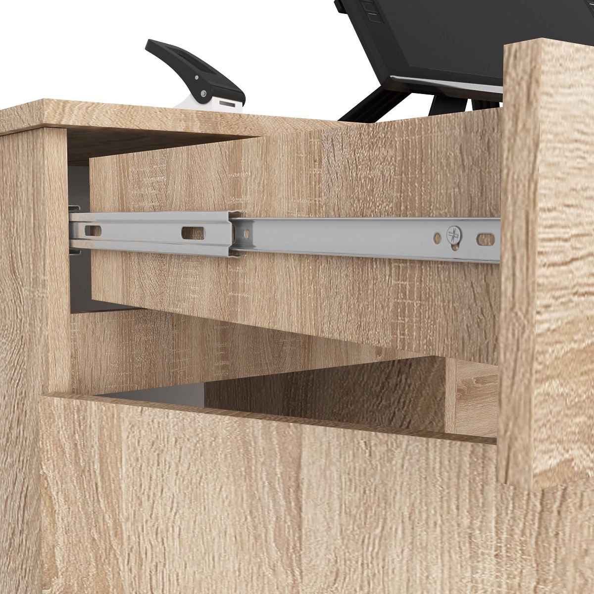 Der Tisch ist in der Farbe Eiche Sonoma gefertigt, was ihm ein sehr elegantes Aussehen verleiht. Er passt perfekt in fast jeden Raum. Er wurde speziell für Computernutzer entworfen, daher verfügt er über ein Tastaturregal und freie Schubladen, in denen wichtige Gegenstände wie Kabel, Disks oder Kopfhörer aufbewahrt werden können. Der Tisch ist zur Selbstmontage vorgesehen. Dank der speziellen Anleitung ist dies jedoch sehr einfach. Sie zeigt übersichtlich, wie man es Schritt für Schritt macht. Obwohl das Möbelstück aus hochwertigen Materialien gefertigt ist und gegen Beschädigungen resistent ist, bieten wir unseren Kunden eine 24-monatige Garantie.