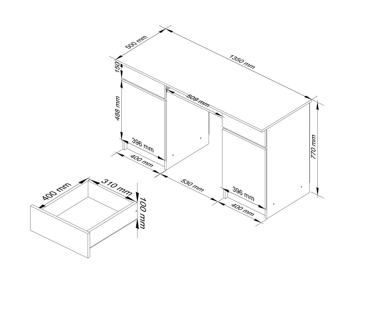 - Fronten der Schubladen und Türen aus laminiertem Plattenmaterial