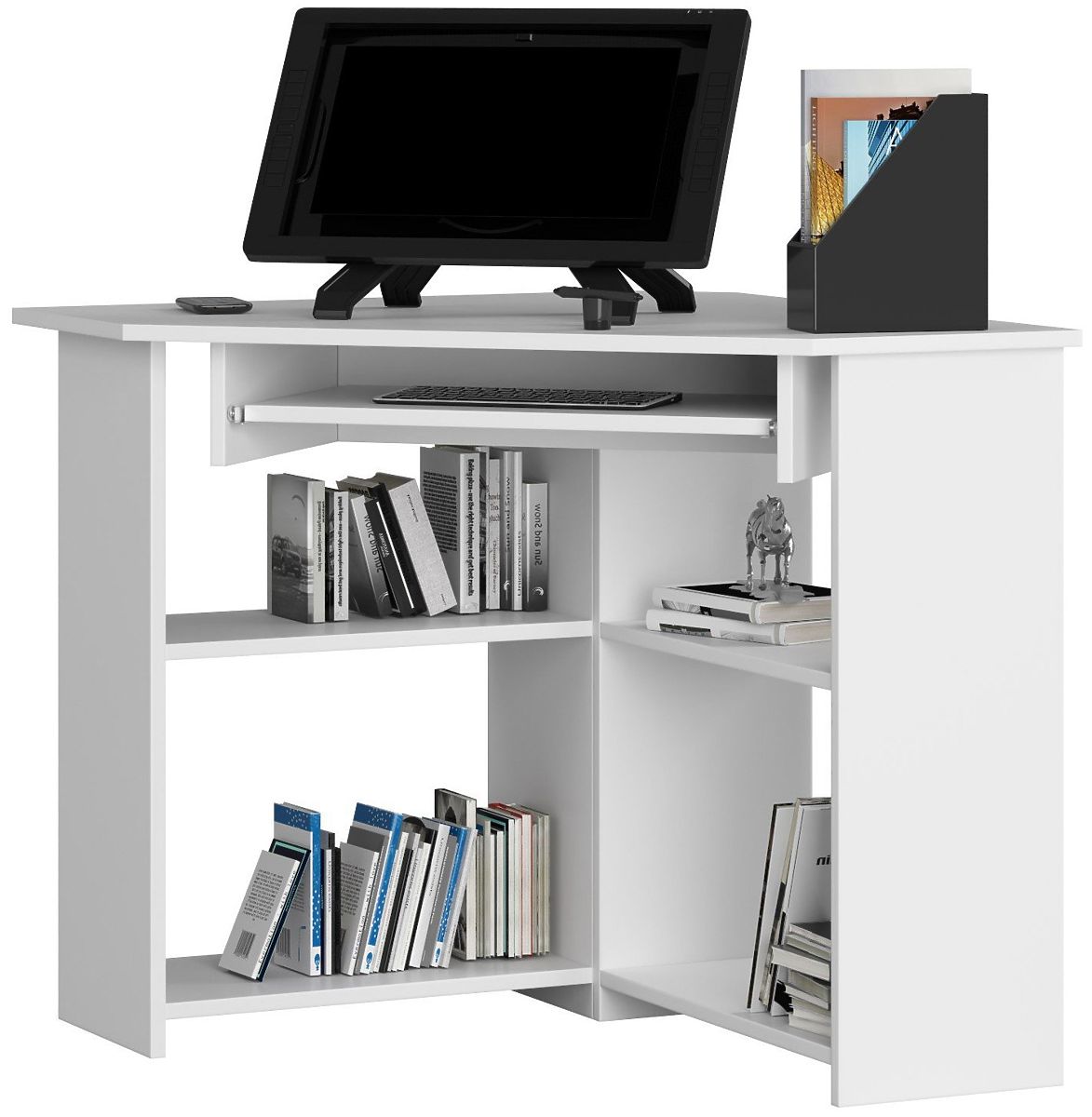 Erwarten Sie Komfort beim Arbeiten von zu Hause aus? Benötigen Sie einen neuen Tisch, der Ihre Anforderungen erfüllt? Wählen Sie ein Modell, das sich perfekt für die Nutzung mit einem Desktop-Computer eignet. In unserem Geschäft ist ein Exemplar erhältlich, das mit einem Platz für die Tastatur und den Hauptteil des Computers ausgestattet ist. Darüber hinaus bietet die Arbeitsplatte ausreichend Platz für die bequeme Platzierung eines Monitors, Notizbuchs, Heften oder Stiften. Der Eckcomputertisch spart viel Platz im Raum oder Büro. Sie können sich auf eine hohe Haltbarkeit verlassen, was der 16 mm starken laminierten Platte zu verdanken ist, aus der er gefertigt ist. Die Platte ist abriebfest, was die Lebensdauer der gesamten Konstruktion erhöht, und ihr Aussehen bleibt lange wie neu.