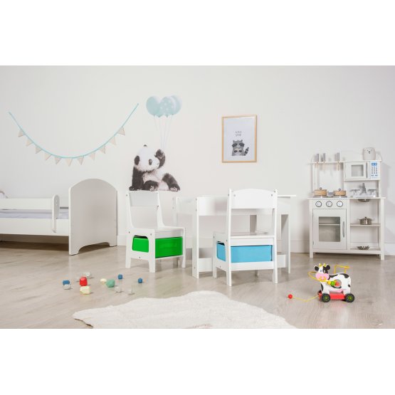 Der schöne, praktische Kindertisch Ourbaby passt perfekt in jedes Kinderzimmer! Auf einer Seite ist eine Tafel, auf der Ihre Kinder frei mit Kreide malen können, und die andere Seite ist eine klassische Tischplatte. Praktische Boxen in Blau und Grün bieten zusätzlichen Stauraum.