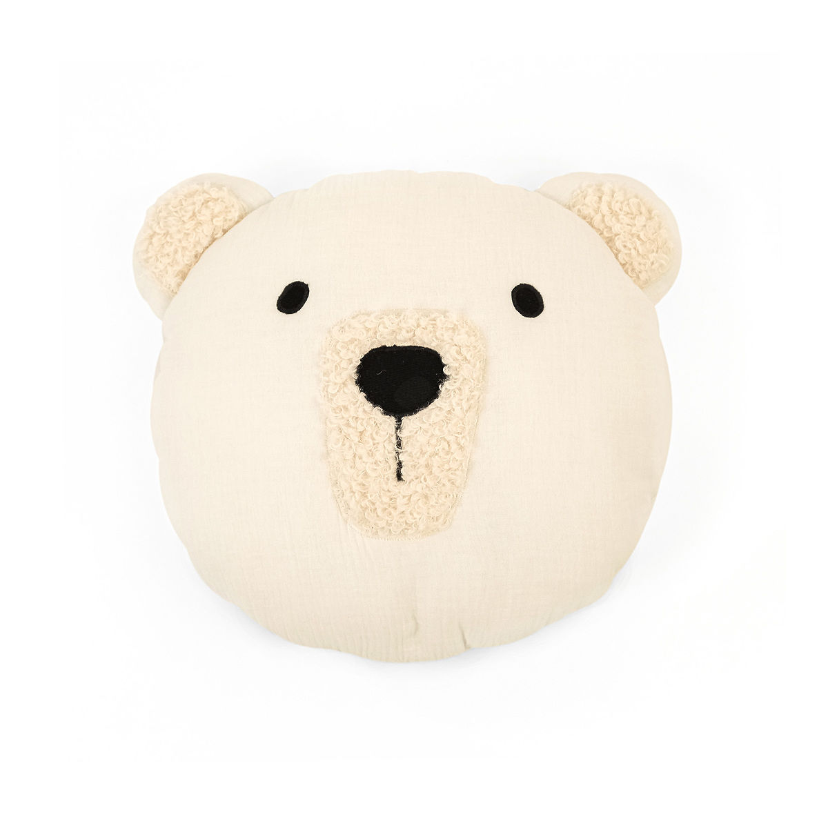 Lassen Sie sich von der Weichheit des Musselins verwöhnen und gönnen Sie Ihrem Kind ein stilvolles Kissen mit Bärenmotiv in ecru, das dem Kinderzimmer einen natürlichen Charme verleiht. Dieses einzigartige Stück in Beige ist aus angenehmem und atmungsaktivem Musselin mit antiallergischer Füllung gefertigt, und die Nase sowie die Mitte der Ohren des Bären bestehen aus weichem Kunstlammfell. Dank des hochwertigen Materials ist das Kissen ideal für die empfindliche Haut des Babys.