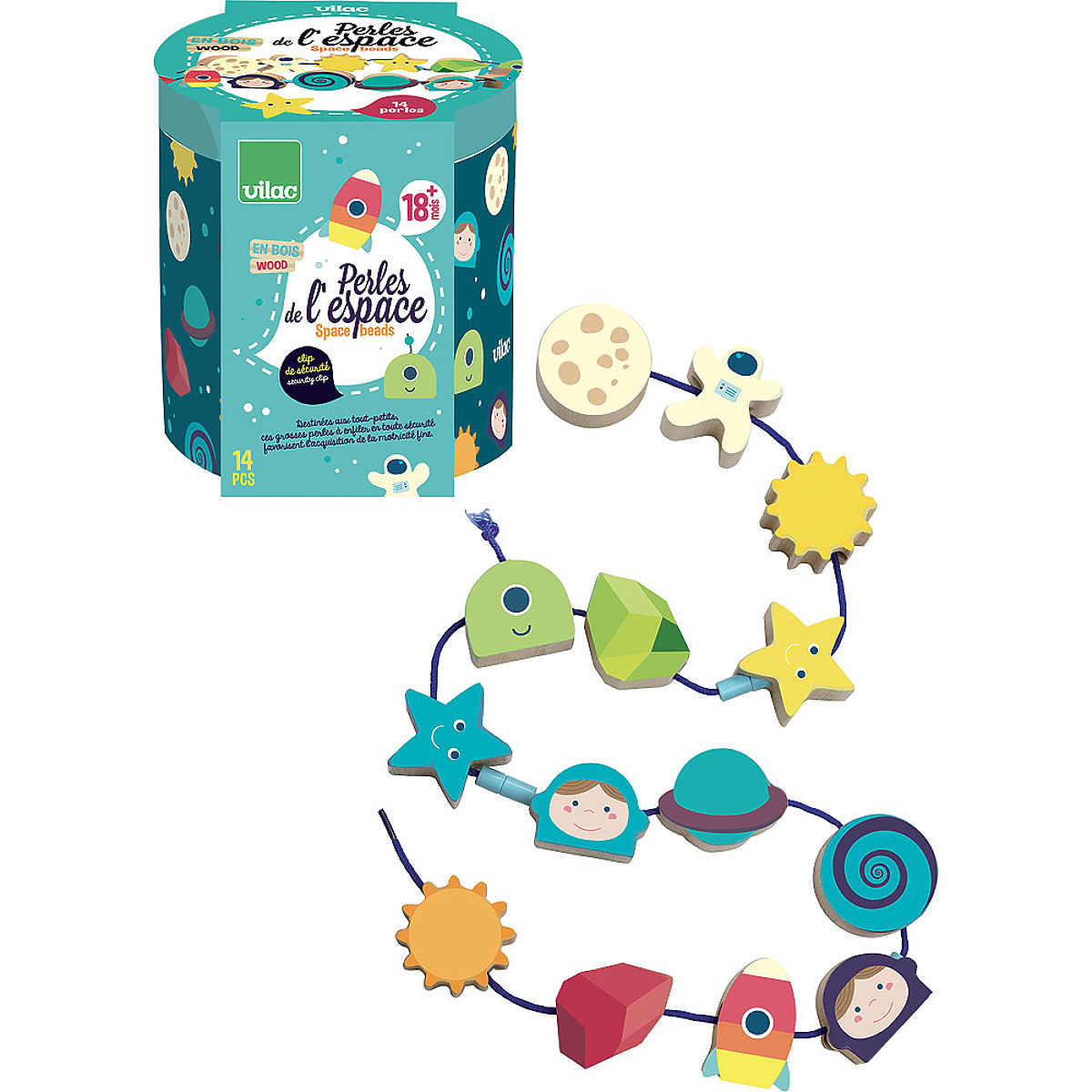 Schönes Fädelspiel mit Weltraummotiv. In der kompakten Verpackung finden Sie 14 illustrierte Holzperlen (z.B. Astronaut, Mond, Sonne, Rakete), die Kinder auf eine Textilschnur fädeln können. Das Spielzeug fördert die Feinmotorik. Ausgestattet mit Sicherheitsverschlüssen. Geeignet ab 18 Monaten. Hauptmerkmale: 14 Fädel-Formen, umweltfreundlich hergestellt, umweltschonend