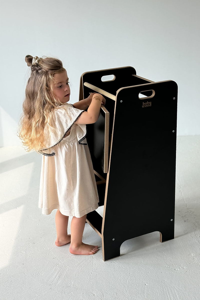 Lernturm Comfort bietet eine sichere und praktische Lösung für Familien, die ihre Kinder in alltägliche Küchenaktivitäten einbeziehen möchten. Dank stabiler Konstruktion und optimaler Arbeitshöhe ermöglicht er es dem Kind, bequem und sicher beim Zubereiten von Speisen zu stehen, während die Eltern alles im Blick haben. Das minimalistische Design passt sowohl in moderne als auch in klassische Küchen.
