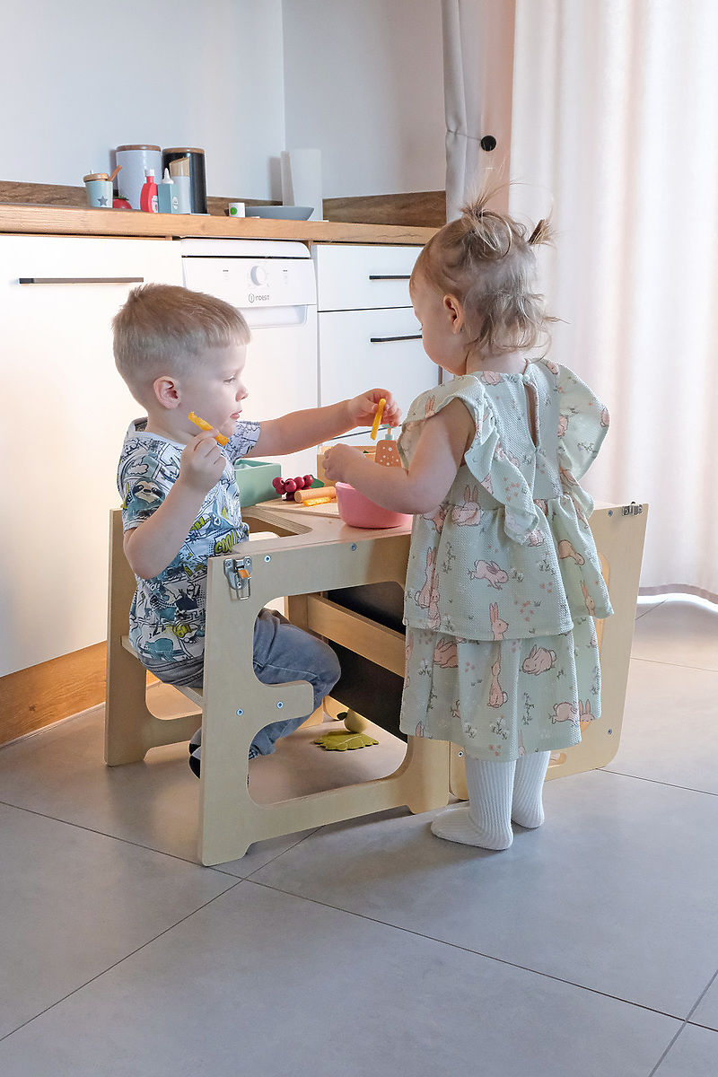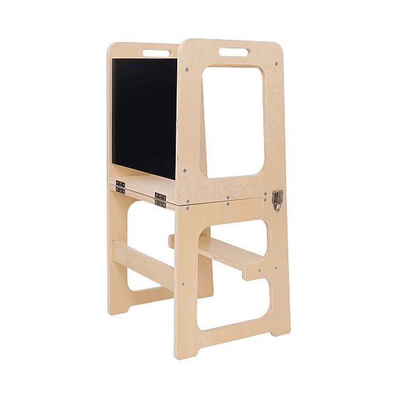 Dieser Lernturm ist nicht nur unterhaltsam, sondern auch multifunktional - er lässt sich leicht in einen praktischen Tisch und Stuhl verwandeln. So schaffen Sie einen sicheren Ort zum Essen, Spielen oder Kreativsein. Teil des Turms ist auch eine Tafel zum Zeichnen.