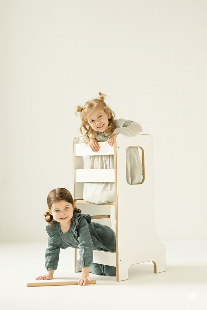 Lernturm SLIM in Weiß ist die ideale Wahl für Eltern, die ihre Kinder sicher in alltägliche Hausarbeiten einbeziehen und ihnen ermöglichen möchten, die Welt aktiv zu entdecken. Dank seiner durchdachten Konstruktion fördert er Selbstständigkeit, Kreativität und die Entwicklung motorischer Fähigkeiten und hilft Kindern, auf natürliche Weise neue Erfahrungen zu sammeln. Gemeinsame Momente beim Kochen oder anderen Aktivitäten werden so zu unterhaltsamen und wertvollen Erlebnissen. Die schlanke Ausführung der SLIM-Version wirkt elegant und nimmt nicht unnötig viel Platz ein, bleibt jedoch stabil und sicher. Kinder können selbstständig in den Turm klettern und sicher wieder heruntersteigen, was ihr Selbstbewusstsein und ihre Unabhängigkeit stärkt.