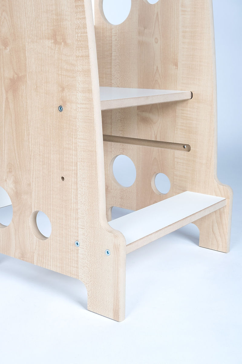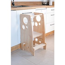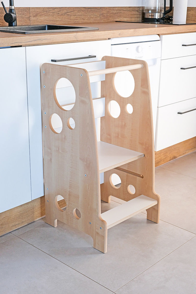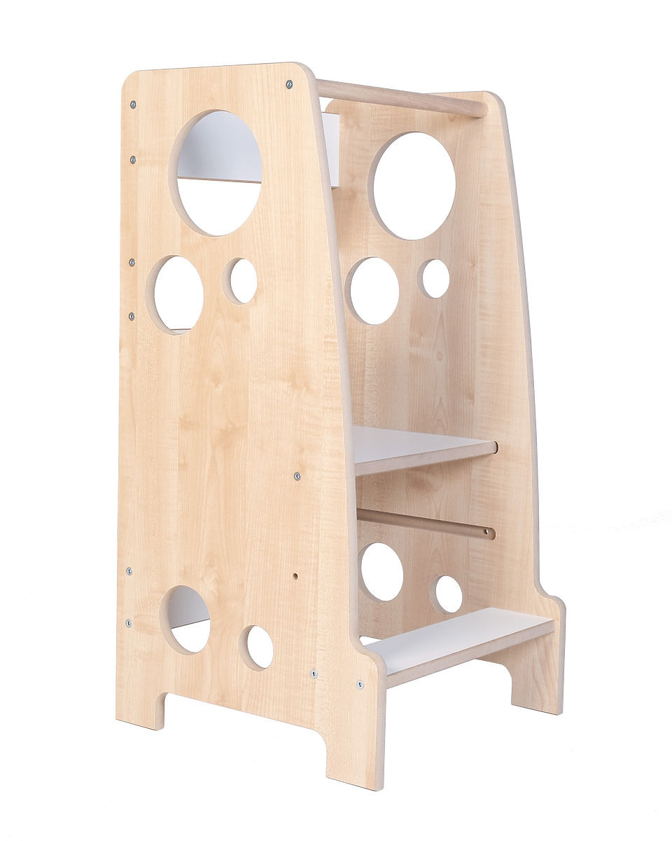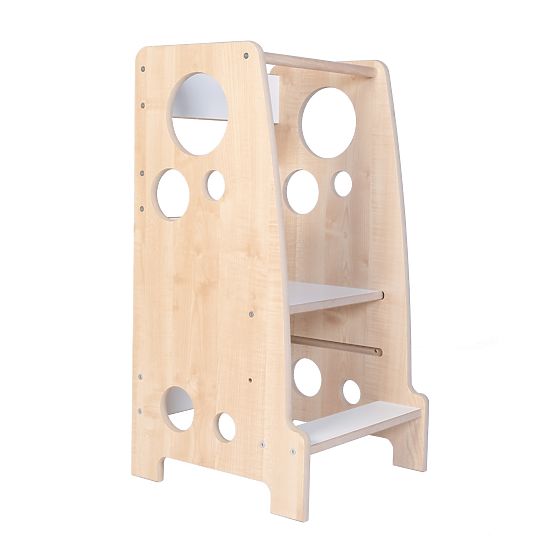 Montessori-Lernturm für Kinder in braunem Design mit kreisförmigen Ausschnitten und weißen Stufen. Es ist ein zuverlässiger und praktischer Helfer, der .. mehr