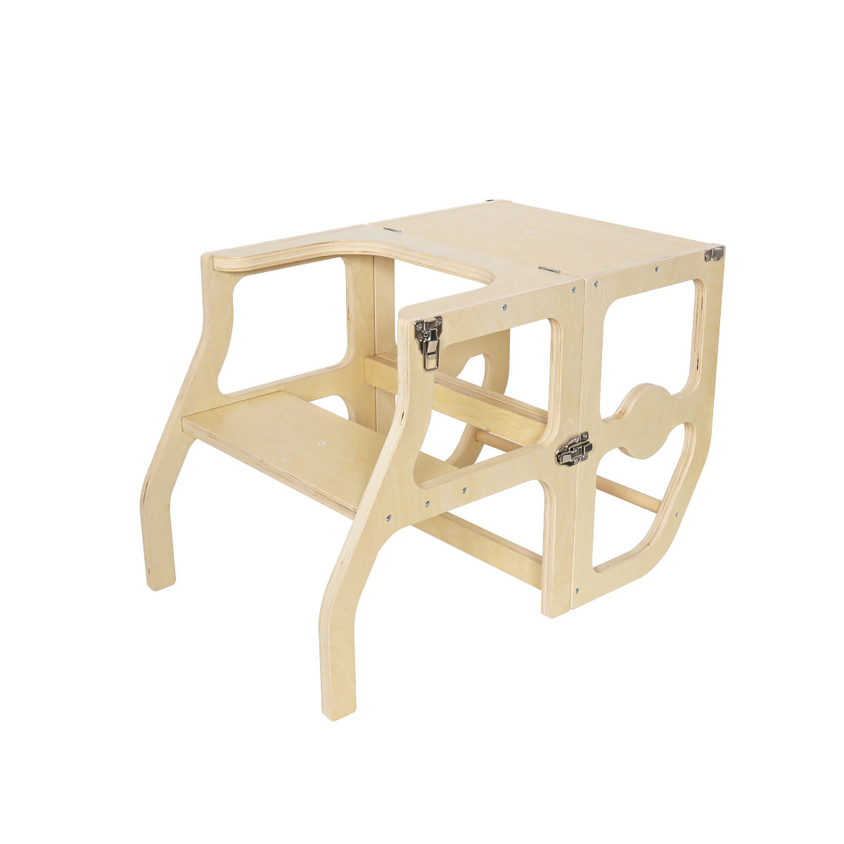 Klapp- und biegbare Konstruktion: verwandelt sich im Handumdrehen vom Lernturm in einen Tisch mit Sitzfläche – ideal zum Spielen, Malen oder für einen Snack.
