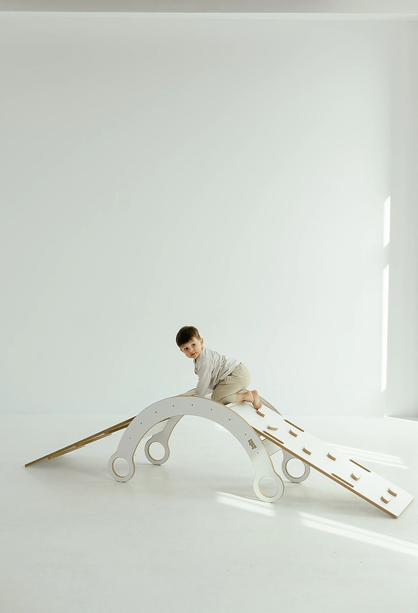 Dank der zusätzlichen Platten bietet das Set noch mehr Spielvarianten. Eine Seite der Platte ist glatt und dient als Rutsche, die andere ist mit Sprossen oder Klettersteinen ausgestattet, die die Kinder zum Klettern und Entdecken neuer Bewegungsfähigkeiten motivieren.