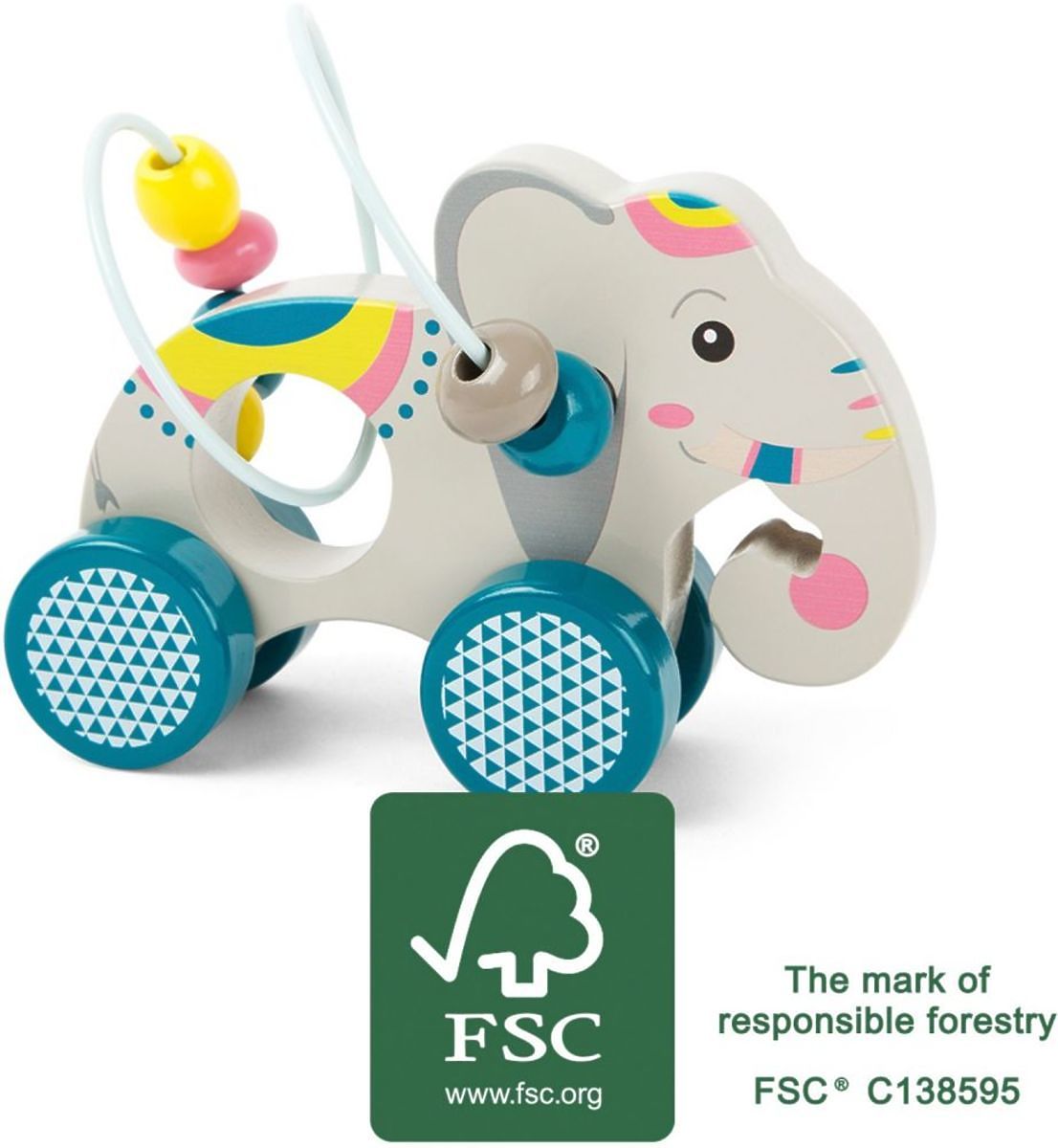 Ein fröhlicher Elefantenfreund ist gleichzeitig ein Spielzeugspielzeug auf Rädern und ein Motorlabyrinth. Modernes Design und sanfte Pastellfarben werden im Kinderzimmer wunderbar zur Geltung kommen. Große gemusterte Räder und Holzperlen in Pink, Gelb und Blau ziehen die Aufmerksamkeit des Kindes auf sich.