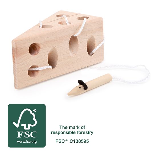 Wer hat sich durch den Käse genagt? Natürlich die kleine Maus! Dieses wunderschöne Fädelspiel ist aus naturbelassenem, lackiertem und 100% FSC-zertifiziertem Buchenholz gefertigt. Es trainiert die Motorik und Geduld. Mit etwas Geschick fädeln Sie die Maus spielerisch durch den ganzen Käse und üben dabei Ihre Fingerfertigkeit und Feinmotorik.