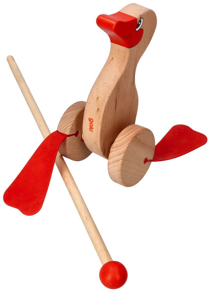 Die Ente ist komplett aus Holz gefertigt, und die Elemente an den Rädern sind aus Gummi. Der Stab ist angeschraubt.