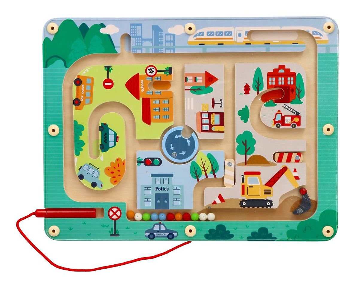 Das neue magnetische Labyrinth von Lelin bringt noch mehr Spaß und Entdeckungen. Bei diesem magnetischen Spielzeug geht es darum, Kugeln mit einem magnetischen Stab durch das Labyrinth zu ziehen. Dadurch entwickelt das Kind motorische Fähigkeiten und hat vor allem viel Spaß. In unserem Labyrinth sind weitere Attraktionen versteckt, wie: zwei Schranken, eine vertikale und eine horizontale, ein Pendelteil eines Baggers, das eine Ecke verschließt, und ein drehbares Element in der Mitte. Um die Kugeln über diese Elemente zu bewegen, müssen sie zuerst geöffnet oder gedreht werden. Mit einem solchen Lernspielzeug übt das Kind viele nützliche Fähigkeiten:
