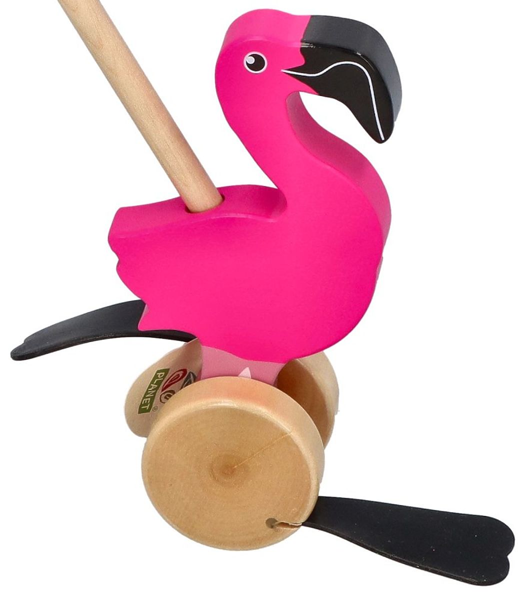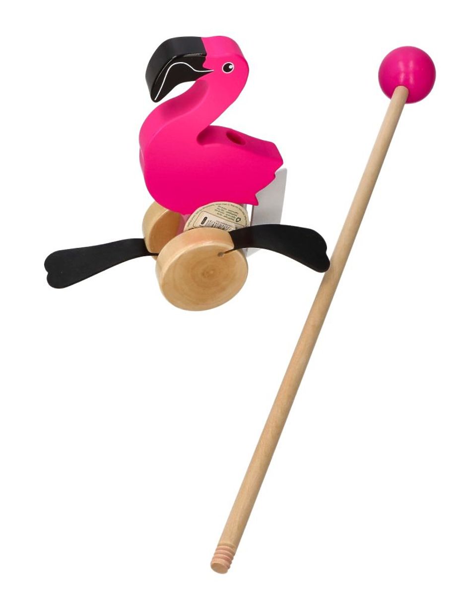 Der Flamingo ist vollständig aus Holz gefertigt und die Elemente an den Rädern aus Gummi.