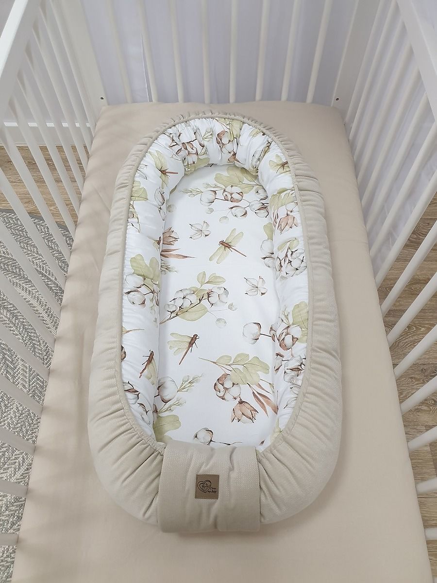 Ein Nest für ein Baby mit dem Motiv von Blumen und Baumwollblättern. Das Nest bietet dem Baby einen gemütlichen und sicheren Platz, ähnlich dem, den es im Bauch der Mutter hatte. Schützt das Kind davor, von der Couch oder dem Bett zu fallen .