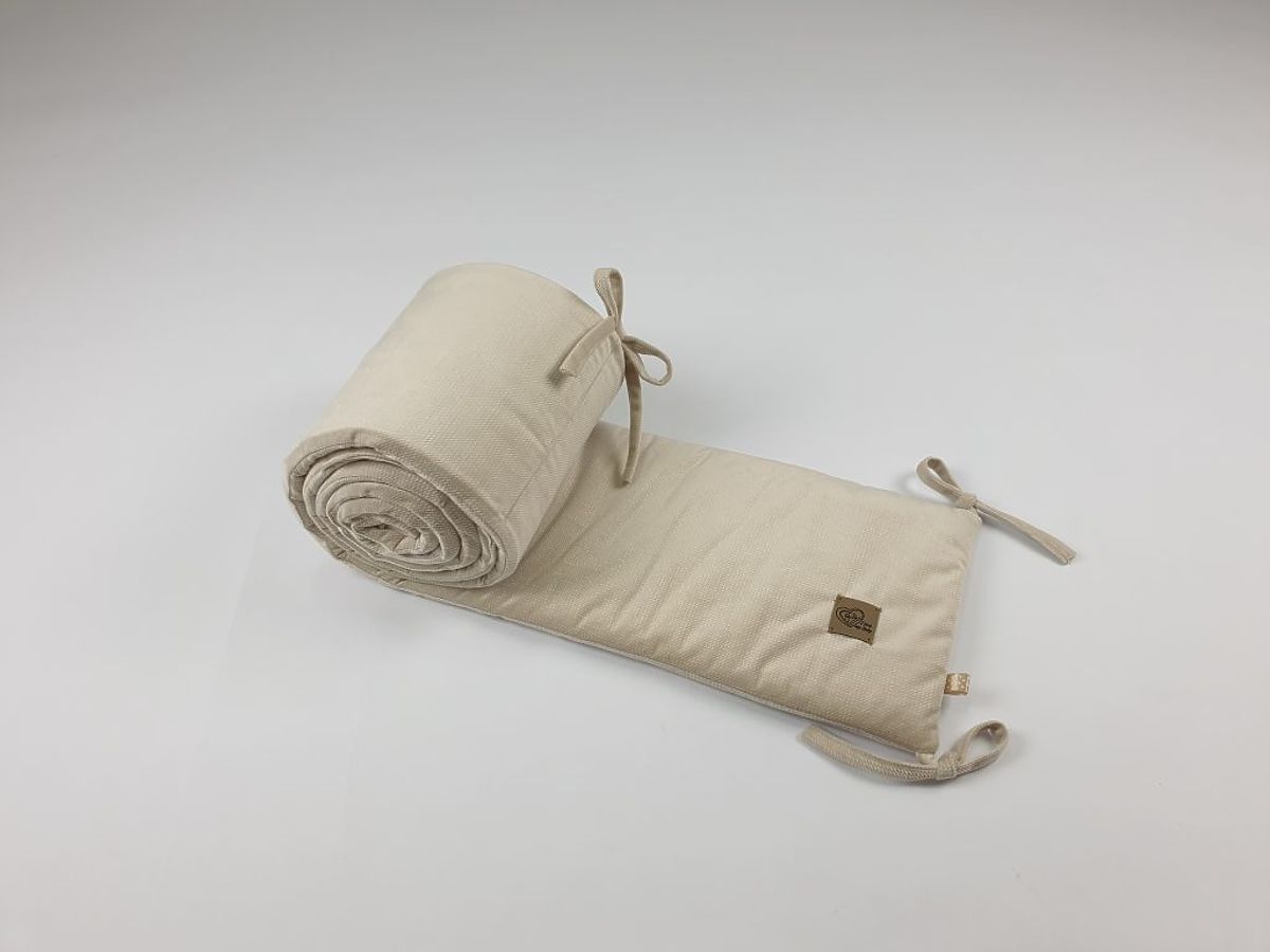 Verwandeln Sie das Babybett in einen ruhigen und gemütlichen Ort mit unseren Polstern in sanftem Beige. Der elegante Farbton lässt sich leicht mit anderen Farben kombinieren und wirkt angenehm warm. Die samtene Oberfläche fühlt sich weich an und die antiallergische Füllung sorgt für Sicherheit, auch für die empfindliche Babyhaut. Die einfache Befestigung mit Bändern stellt sicher, dass das Polster genau dort bleibt, wo es sein soll.