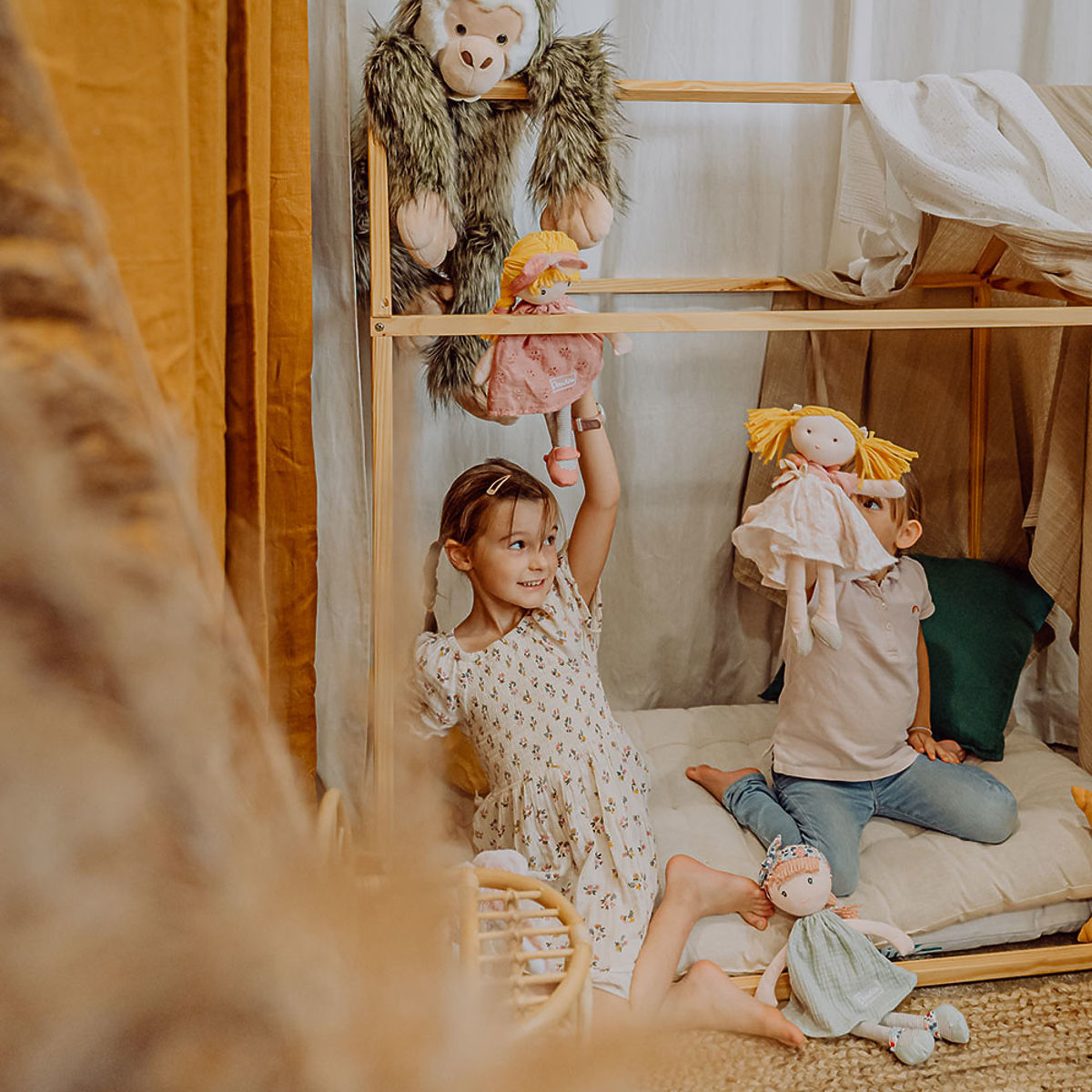 Die Stoffpuppe Suzette ist oft verträumt und taucht gerne in Gedanken in wunderschöne Geschichten ein. Sie trägt gerne hübsche, fließende rosa Kleider aus Baumwolle, bestickt mit Blumen, rosa Ballerinas und ein Stirnband mit einer großen Schleife und einem Hauch von Tüll. Die Kleidung kann ausgezogen und wieder angezogen werden. Die Puppe wird in einer originalen Geschenkbox geliefert. Das Spielzeug erfüllt die europäischen Sicherheitsnormen CE. Pflege: Waschen Sie es bei 30° in der Wanne. Empfehlung: Natürliches oder Niedrigtemperaturtrocknen. Hauptmerkmale: geeignet ab Geburt, Baumwollgesicht, gestickte Augen und Mund sowie Sommersprossen, Puppe mit Zubehör, das ausgezogen und angezogen werden kann, in Geschenkbox