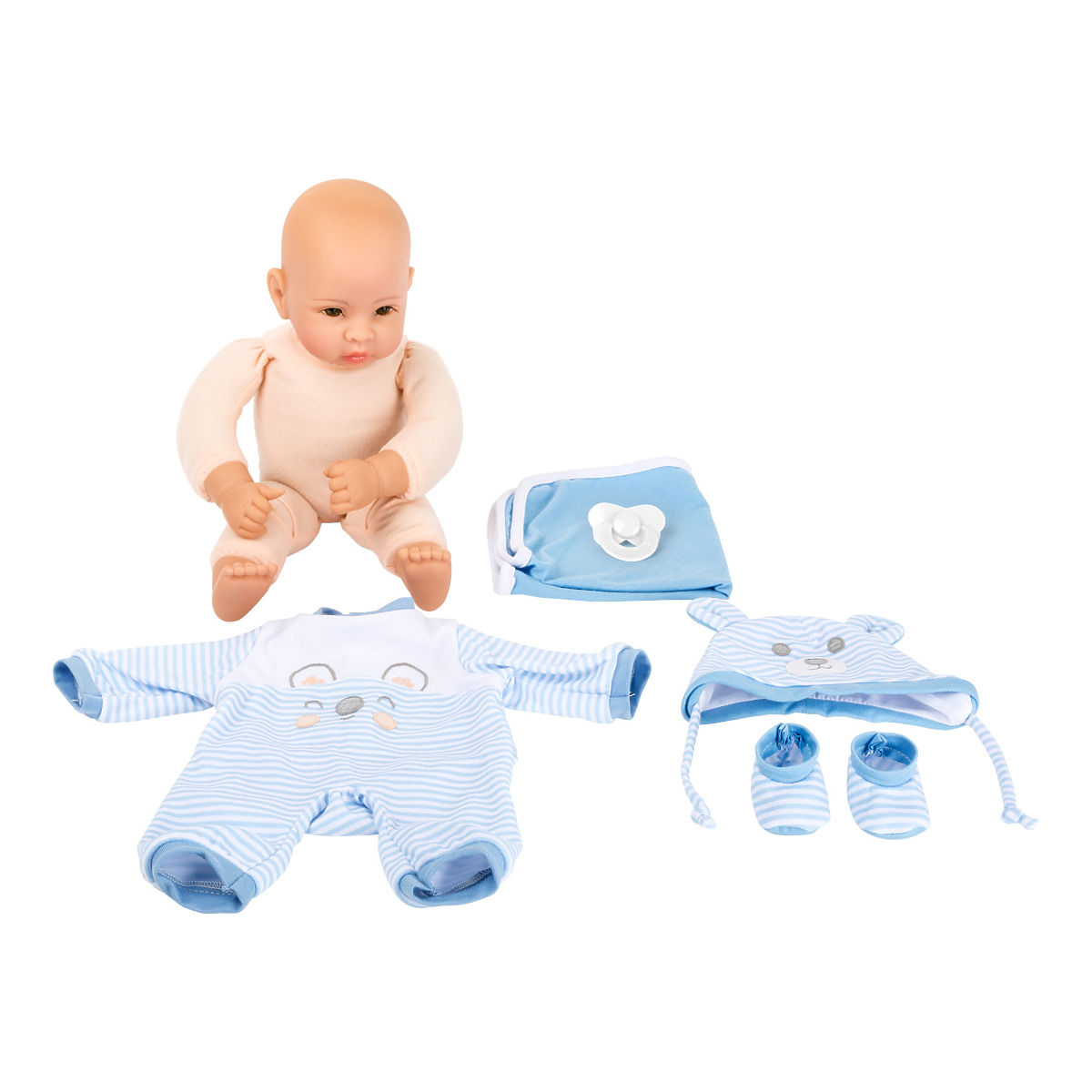Puppe Lukas mit weichem Stoffkörper und Kunststoffkopf und -gliedmaßen mit vielen Accessoires. Die Kleidung für die Puppe lässt sich leicht an- und ausziehen. Im Lieferumfang sind auch ein farblich abgestimmter Schnuller und eine Decke enthalten. Besonders realistischer Gesichtsausdruck mit schönen, nicht blinkenden Augen. Puppen mit weichem Körper sind ideal für jüngere Kinder, deren motorische Fähigkeiten noch nicht so weit entwickelt sind. Das Spielen mit Puppen fördert die Entwicklung von Fantasie und sozialen Fähigkeiten. Der perfekte Spiel- und Kuschelbegleiter dank des weichen Körpers. Hauptmerkmale: weicher Stoffkörper, fördert Fantasie und soziale Fähigkeiten, Puppenkleidung im Lieferumfang enthalten