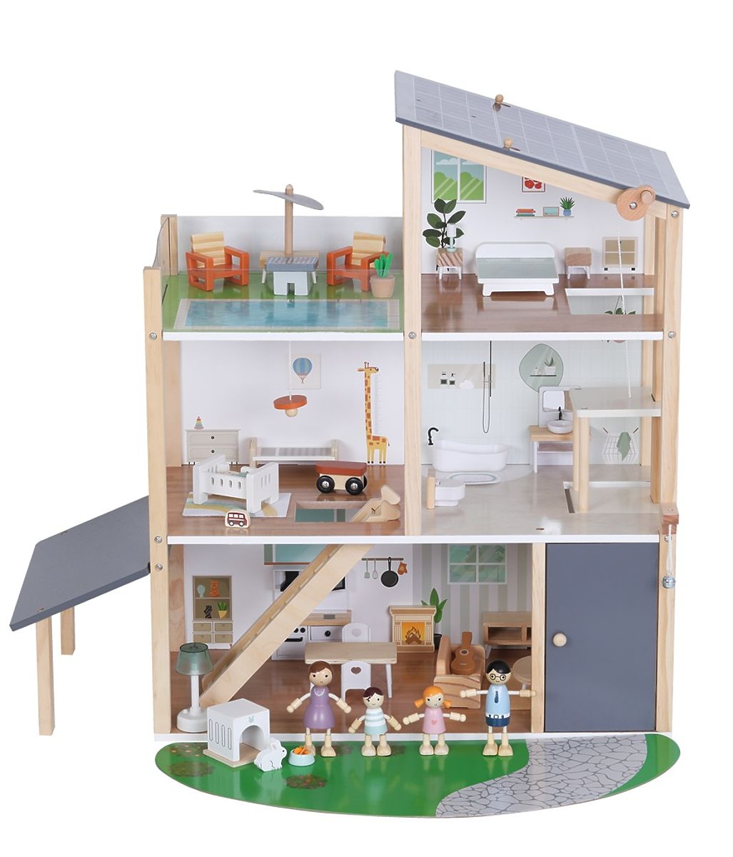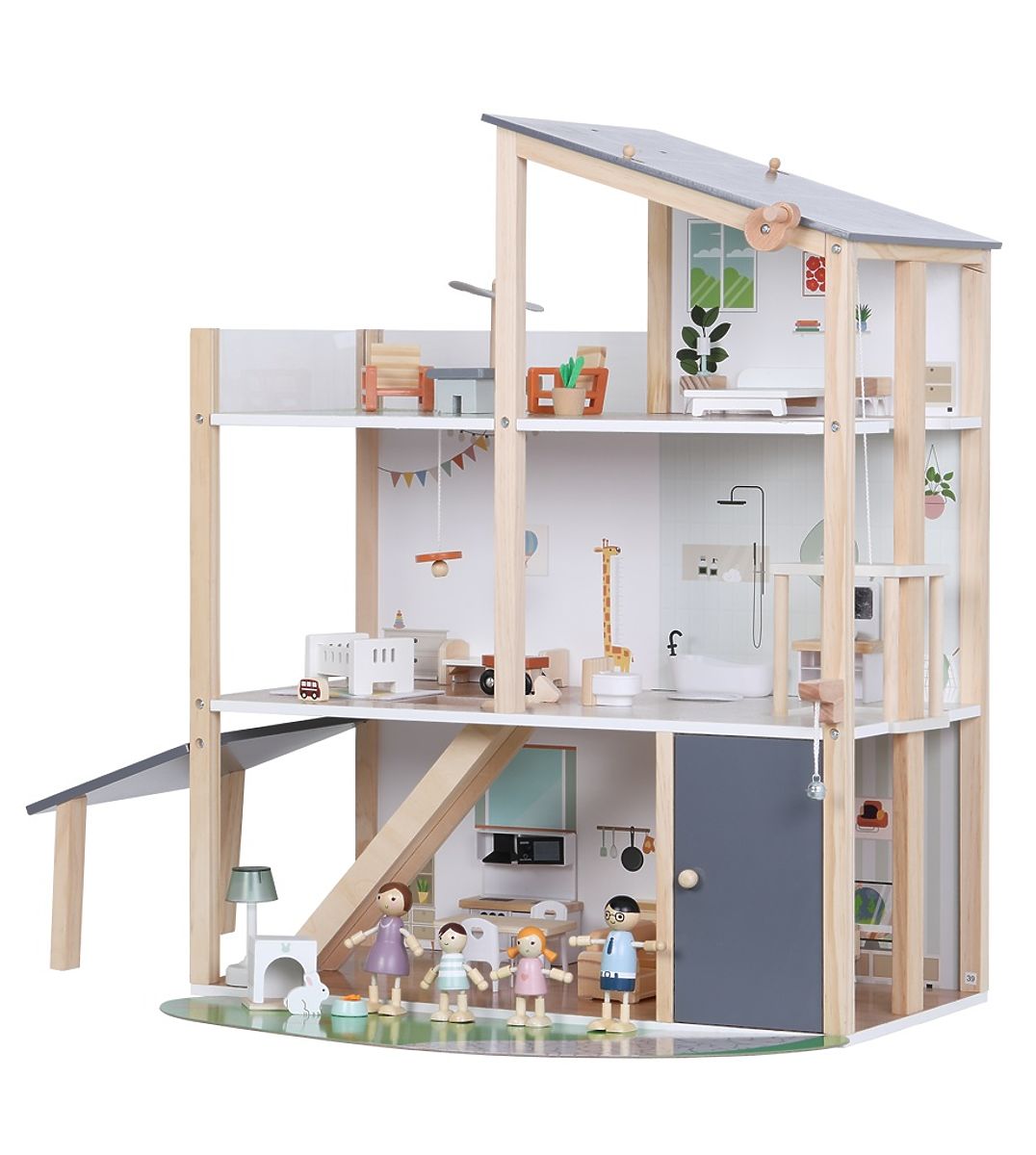 Willkommen im Puppenhaus, wo das Wohnen pure Freude ist! Das geräumige Holzhaus ist komplett mit Möbeln und Zubehör ausgestattet. Es bietet eine geräumige Küche, die mit einem gemütlichen Wohnzimmer verbunden ist, ein stilvolles Badezimmer mit Badewanne, ein Kinderzimmer, ein Schlafzimmer und eine luxuriöse Dachterrasse für entspannte Momente. Und als ob das nicht genug wäre, gibt es auch einen Aufzug. Drehen Sie die Kurbel und bringen Sie die Familie bis in den zweiten Stock. Zum Set gehört ein niedliches Haustier, ein Häschen mit eigenem Häuschen, und eine vierköpfige Familie, die bereit ist, sich einzuleben und ihre Geschichte zu beginnen. Beim Spielen entwickeln Kinder ihre Fantasie, soziale Fähigkeiten und ein Auge für Details. Und vor allem haben sie großen Spaß! Das verspielte Design, die sanften Farben zusammen mit der hochwertigen Verarbeitung machen dieses Spielzeug zu einem schönen Accessoire für jedes Kinderzimmer oder Spielzimmer. Das Puppenhaus wird zerlegt geliefert und erfordert Montage. Eine Montageanleitung ist im Lieferumfang enthalten. Hauptmerkmale: 41 Teile, komplett ausgestattetes Holzhaus mit 4 Familienfiguren, fördert Fantasie, Kreativität und Rollenspiel, regt zu fantasievollem Spiel an, hochwertige Verarbeitung und attraktives Design, wird zerlegt geliefert, Montage erforderlich, Montageanleitung im Lieferumfang enthalten, geeignet für Kinder ab 3 Jahren.