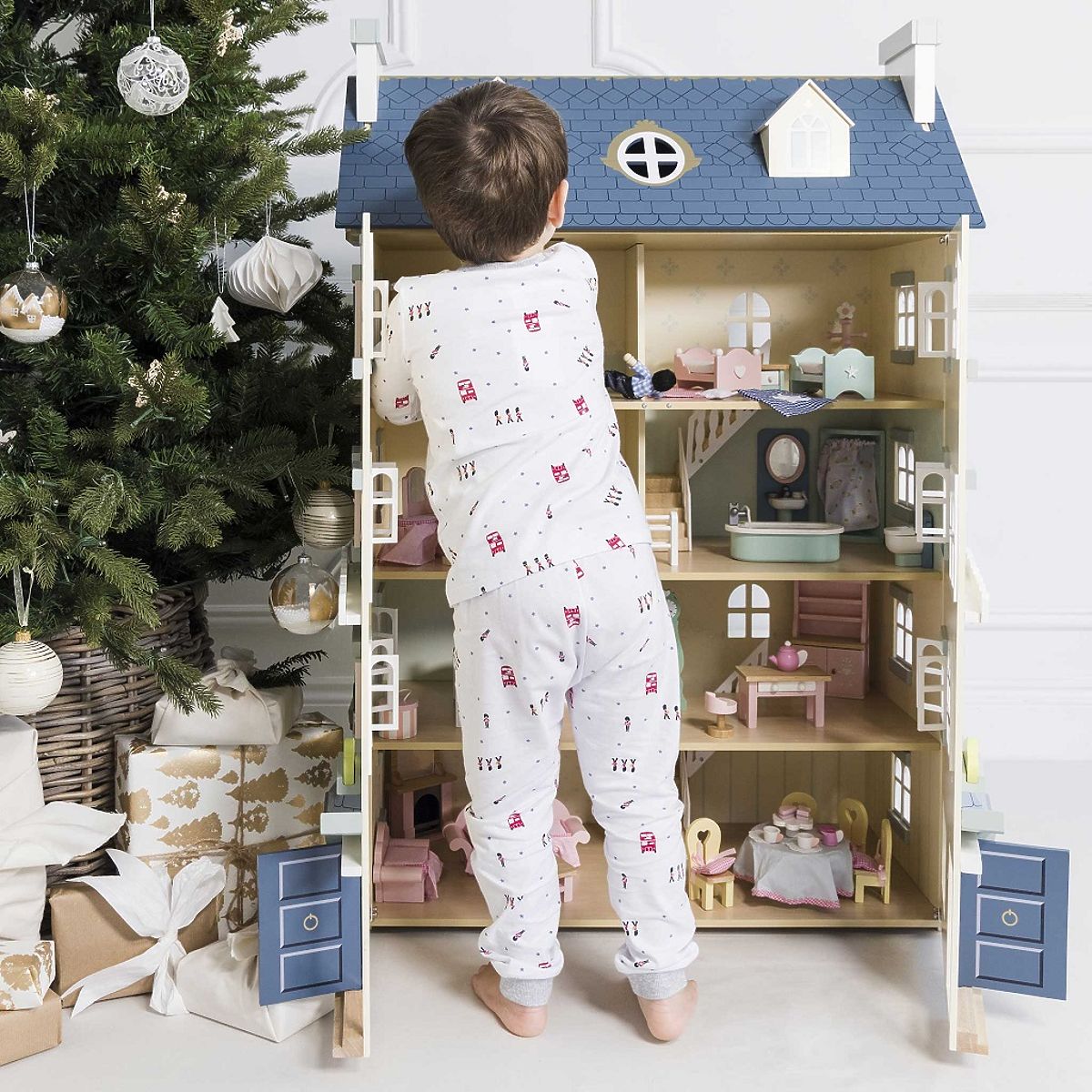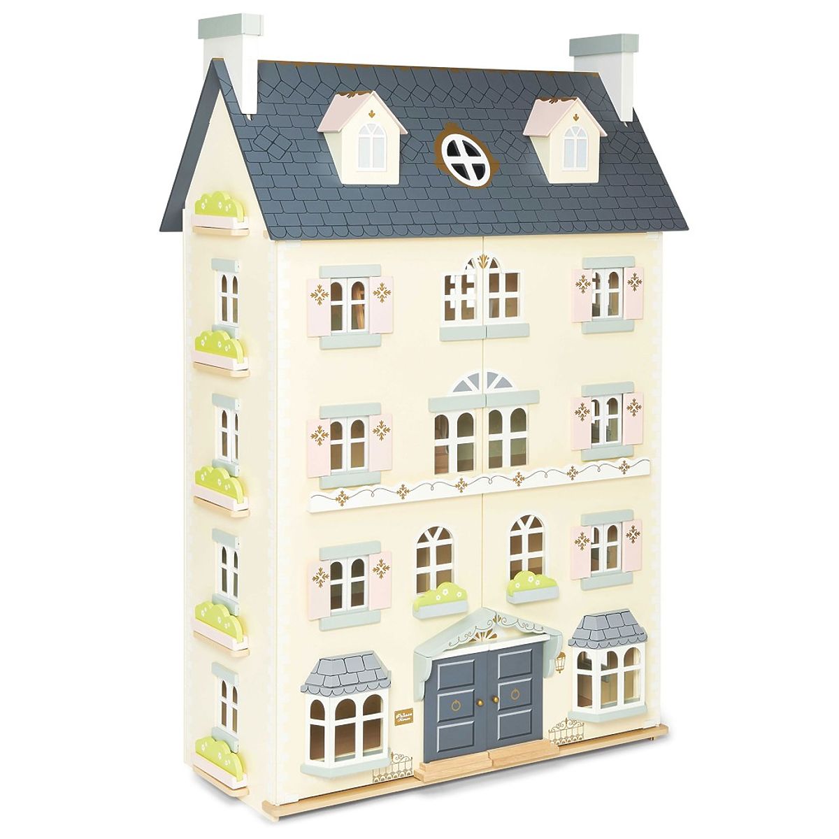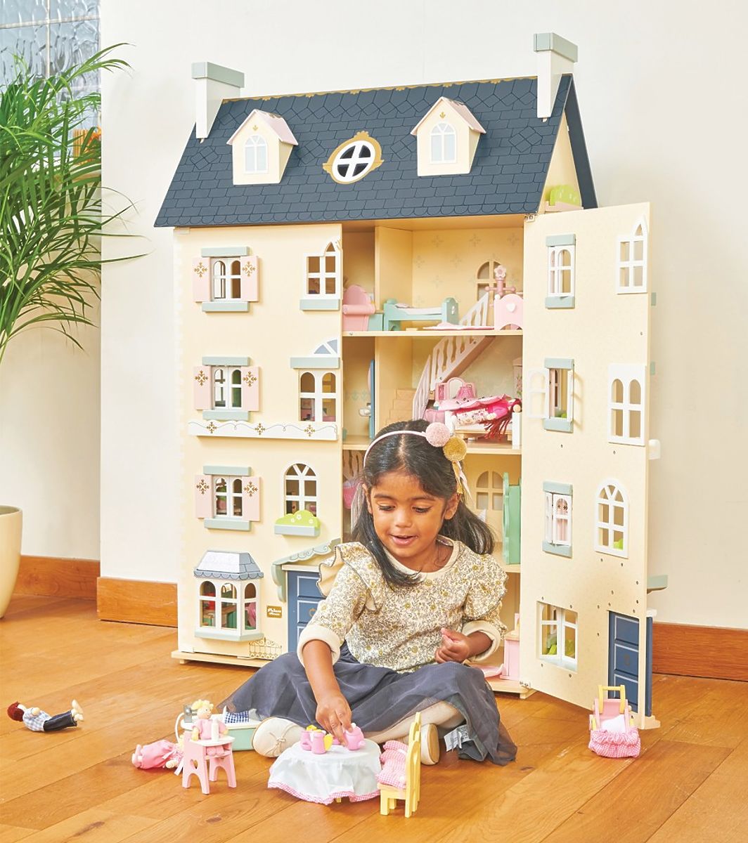 Sie haben gerade eine Einladung in den Palast erhalten! Dieses luxuriöse Puppenhaus ist Ihrer königlichen Hoheit würdig. Der große Palast für Prinzen und Prinzessinnen ist wie aus einem Traum, bereit für kleine und große Abenteuer. Es wird sicherlich jedes Kinderzimmer erhellen. Führen Sie die Kinder in die magische Welt der Fantasie ein, das hohe Puppenhaus mit fünf Etagen ist in neutralen Tönen bemalt, die Details sind golden. Auf jeder Seite finden Sie viele Fenster, einige davon sind zu öffnen, ebenso wie die wunderschönen Eingangstüren in königlichem Blau. Alle acht Zimmer sind mit eleganten Wanddekorationen versehen, die große Treppe reicht bis in den vierten Stock und ist mit schönen traditionellen Verzierungen geschmückt. Das abnehmbare Dach offenbart einen geräumigen Dachboden, der mit Hilfe einer Leiter erreicht werden kann. Die Familie kann sich dort einrichten oder ihn als Stauraum nutzen. Es hängt ganz von Ihrer Vorstellungskraft ab. Ein außergewöhnliches Spielzeug voller Freude und Nostalgie, mit dem Kinder viele Jahre magisches Spiel genießen werden. Das Puppenhaus kann von Generation zu Generation weitergegeben werden. Alle Puppenhäuser von Le Toy Van wurden von einem Team aus Großbritannien entworfen und unter Verwendung ethischer Praktiken und nachhaltiger Materialien hergestellt. Das Puppenhaus kann mit Holzmöbeln, Puppen und anderen Accessoires aus der Daisylane-Kollektion ausgestattet werden. Spielzeug mit Zweck: Alle Spielzeuge von Le Toy Van sind darauf ausgelegt, lange zu halten. Mit Liebe von erfahrenen Handwerkern entworfen, unter Verwendung ethischer Praktiken und nachhaltiger Materialien, die freundlicher zu unserem Planeten sind. Hauptmerkmale: ethisch aus nachhaltigem Holz hergestellt, nach den strengsten Standards getestet, mit ungiftigen, wasserbasierten Farben bemalt, Möbel und Puppen sind nicht im Lieferumfang enthalten, inspiriert zu fantasievollem und langanhaltendem Spiel, unterstützt die Entwicklung der Hand-Auge-Koordination, geschlechtsneutrales Design, nach dem Auspacken gemäß Anleitung zusammenzubauen. Auszeichnungen des Spielzeugs: Junior Design Silver Award 2019. Daisylane-Kollektion: Eine prestigeträchtige Kollektion von Puppenhäusern und Accessoires von Le Toy Van. Vor über 25 Jahren entwarf der Gründer Georges sein allererstes Puppenhaus, den Grundstein dieses Unternehmens. Ethisch aus nachhaltigen Materialien hergestellt, sind die Daisylane-Holzpuppenhäuser einzigartig und werden die kindliche Vorstellungskraft nicht zurückhalten. Ein Familienerbe, eine echte Investition ins Spielen.
