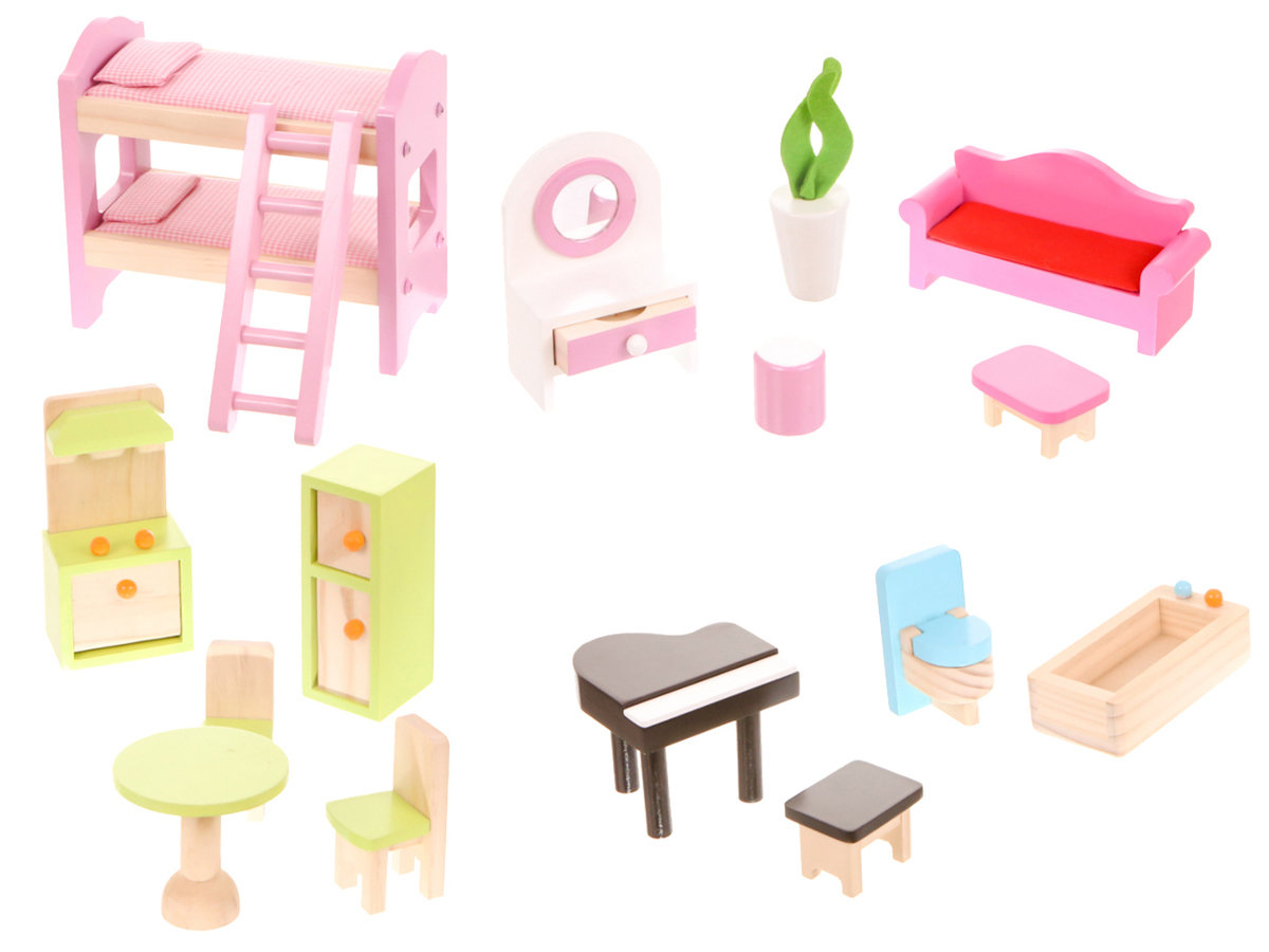 Schöne Holzpuppenhaus mit einem Satz von Geschirr und Puppen, ist ein Traum für alle Mädchen .. mehr