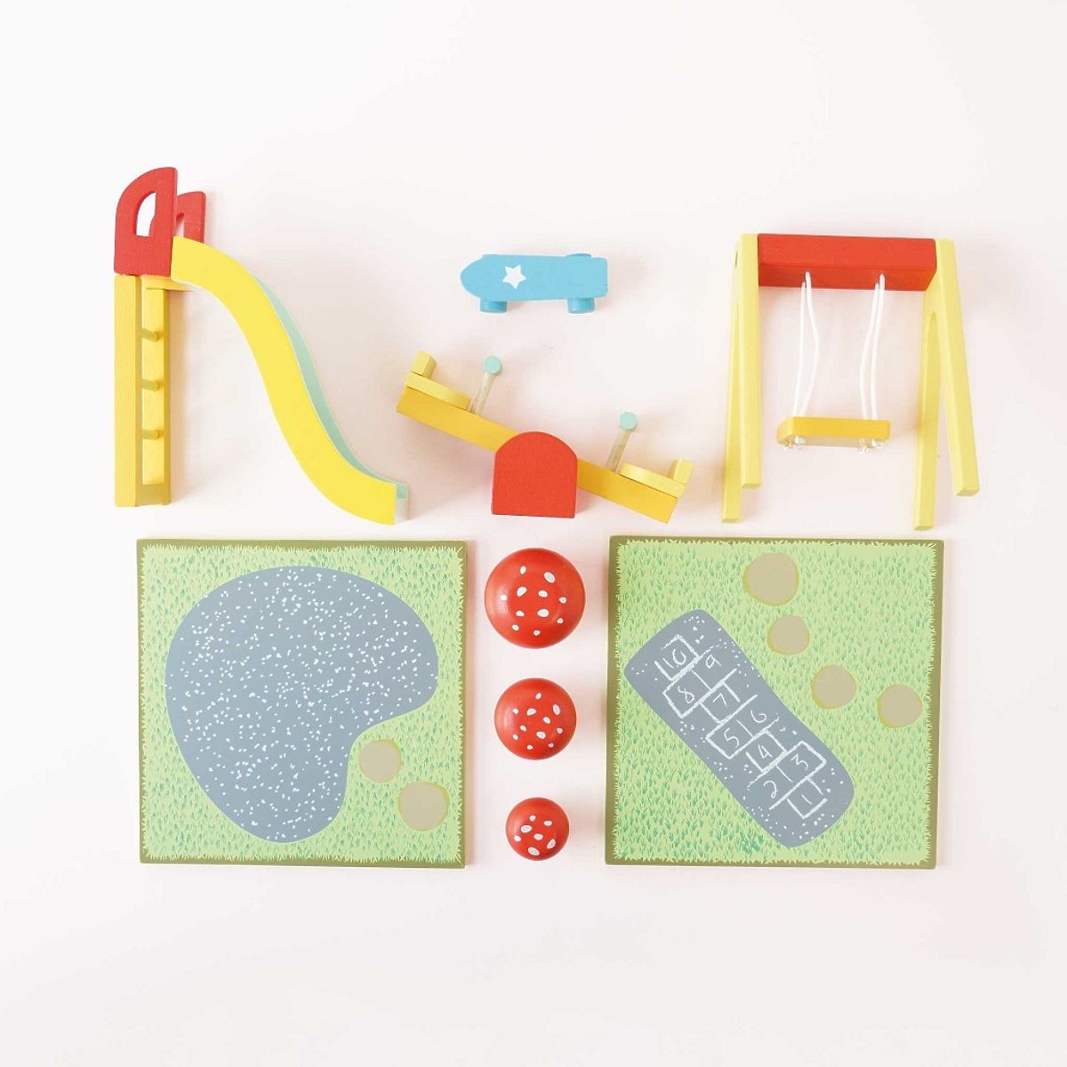 Das Spielplatz-Set aus Holz ist mit allen Häusern und Figuren von Le Toy Van kompatibel. Enthält eine Rutsche, 2 Arten von Schaukeln, ein Skateboard und eine .. mehr