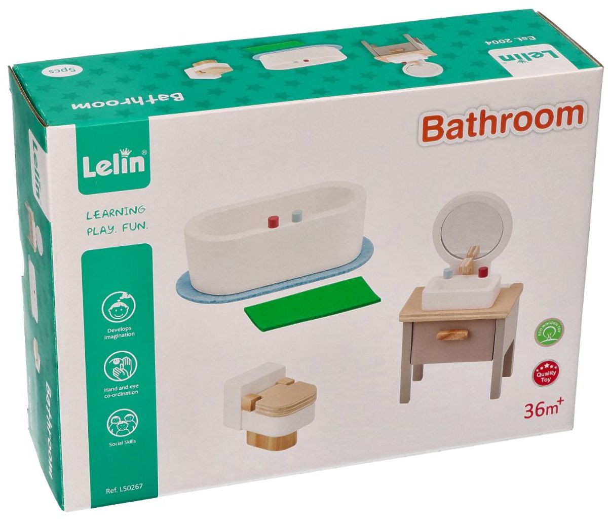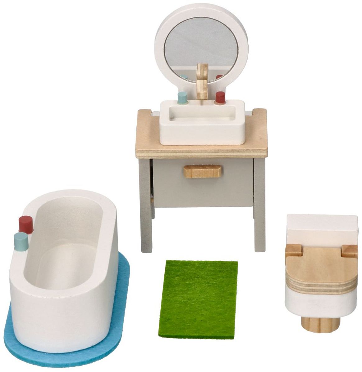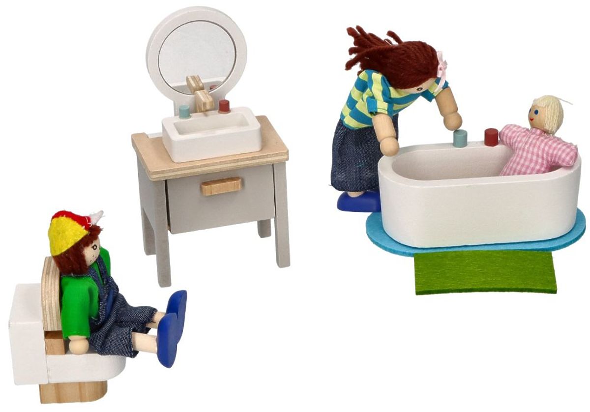Ein niedliches Set von Badezimmermöbeln aus Holz, ideal für das Puppenhaus. Das Set umfasst eine Badewanne, ein Waschbecken mit Spiegel und eine Toilette. Jedes Element wurde sorgfältig mit Augenmerk auf Details und Sicherheit beim Spielen gefertigt – alle Kanten sind glatt geschliffen.