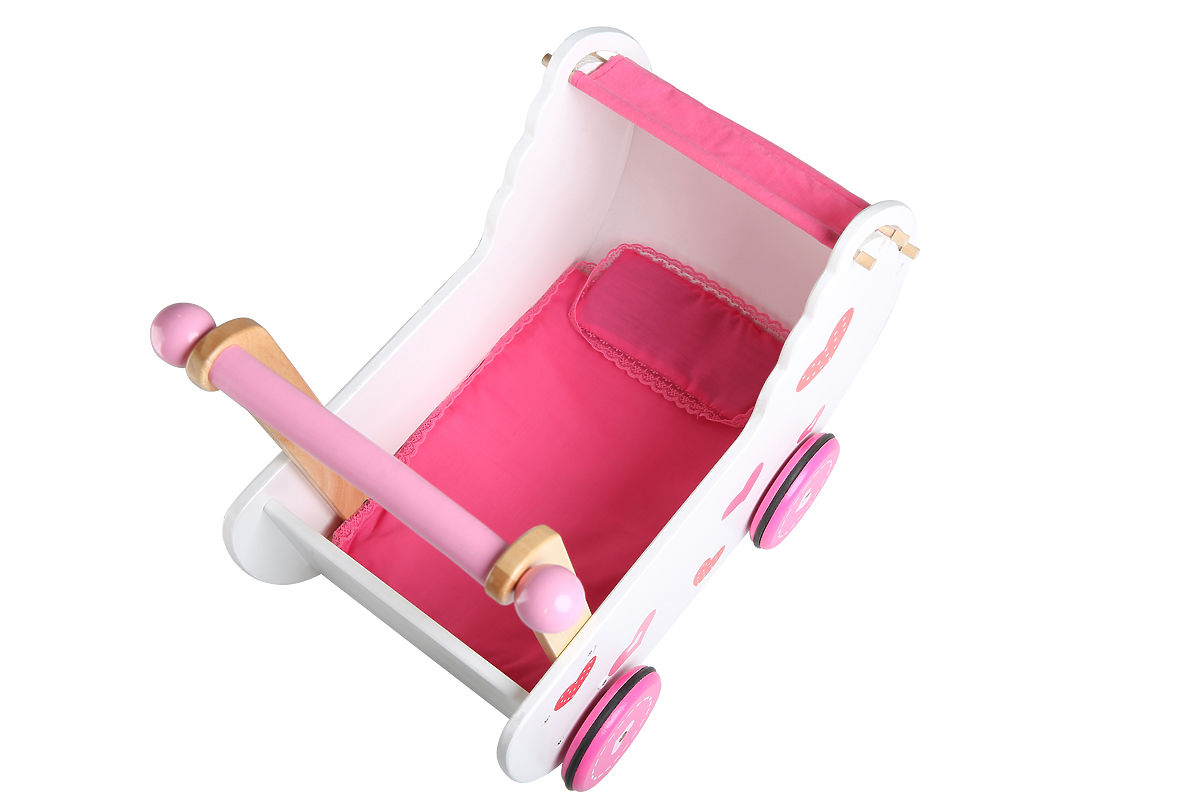 Ein Holzwagen für Puppen, der bei Spaziergängen auch als Rollator dienen kann. Der Kinderwagen hilft dem Kind, Stabilität und Gleichgewicht zu bewahren und beschleunigt den Gehunterricht. Der Griff befindet sich in einer für Kleinkinder geeigneten Höhe. Für mehr Sicherheit gibt es eine spezielle Anti-Rutsch-Behandlung der Räder.