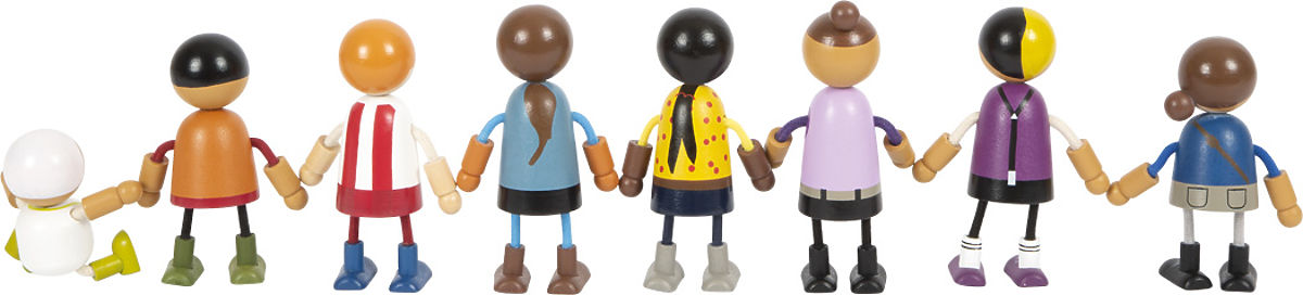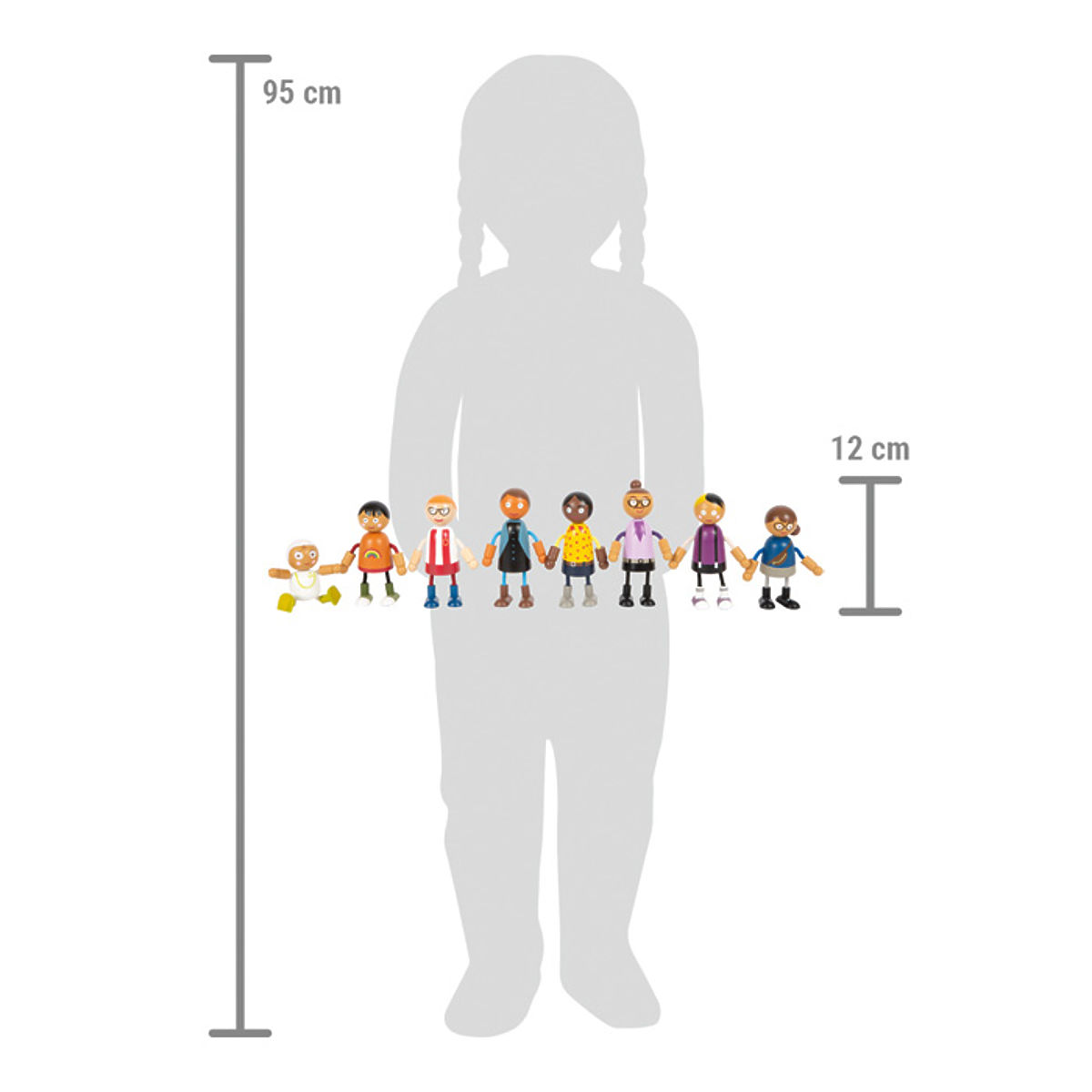 Diese große Familie von biegsamen Holzpuppen ist für jedes Puppenhaus geeignet. Sie besteht aus 8 Familienmitgliedern unterschiedlichen Geschlechts und Alters. Die Biegepuppen haben einen Kopf und Körper aus massivem Holz, während ihre Arme und Beine aus biegsamem Textilmaterial bestehen. Zwei Elternpaare, drei Kinder und ein Baby in einer Trage, die an den anderen Biegepuppen befestigt werden kann, bieten viele verschiedene Spielmöglichkeiten. Aktives Rollenspiel lehrt Kinder auf spielerische Weise, wie vielfältig der Lebensstil sein kann. Rollenspiele fördern die Entwicklung von Identifikation, Kommunikation, Vorstellungskraft sowie sozialen und emotionalen Fähigkeiten. Die Biegepuppen sind aufgrund ihrer Größe leicht für kleine Kinderhände zu greifen. Ein ideales Zubehör für die Stadtvilla mit Puppenhaus (11802) oder die kompakte Stadtvilla (12277). Hauptmerkmale: 8-köpfige flexible Puppenfamilie fördert Vorstellungskraft, Kreativität und soziale Fähigkeitenrealistischer Spielspaß dank biegsamer Arme und Beineflexibel, robust und detailreichFigurengröße ist leicht für Kinderhände zu greifen