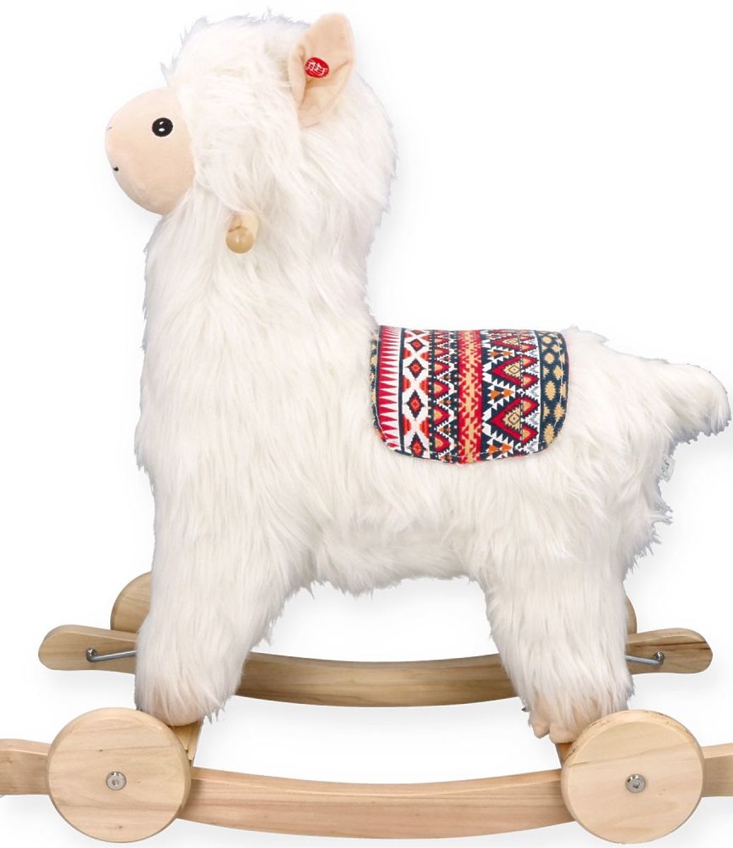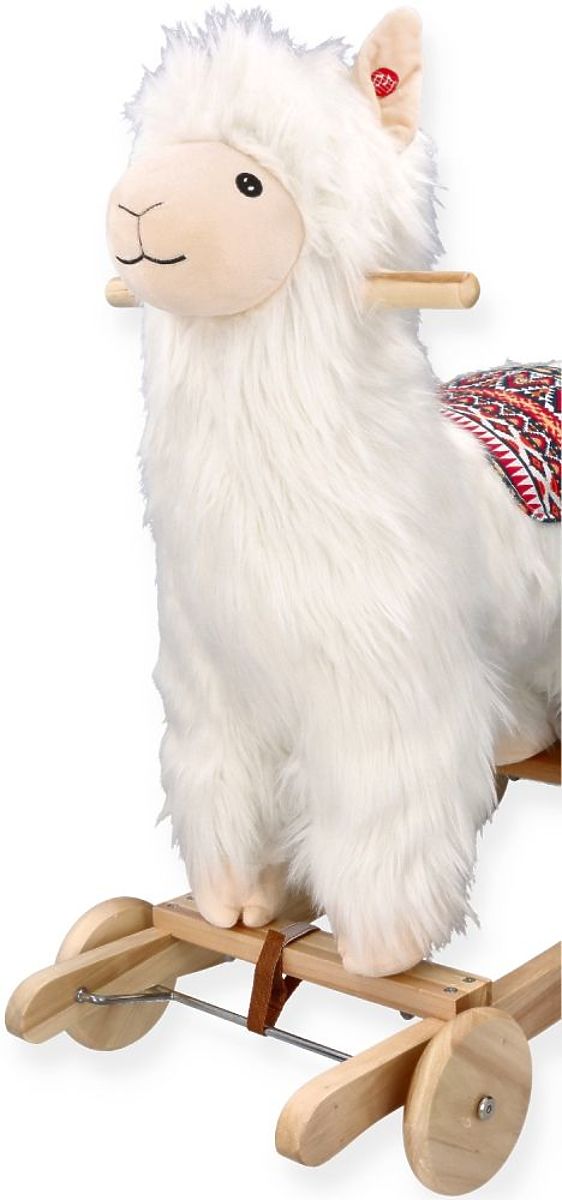 Dieses neue, einzigartige Design lässt unser Alpaka unter ähnlichen Produkten hervorstechen. Das Alpaka wurde aus einem besonders weichen und leicht flauschigen Material hergestellt, um einem echten Alpaka zu ähneln. Mit einem fröhlichen Gesicht und einem bunten Sattel mit peruanischen Mustern sieht es wirklich außergewöhnlich aus. In einem Ohr befindet sich ein Knopf, der eine Melodie abspielt. Außerdem ist das Alpaka mit Rädern ausgestattet, sodass es auf zwei Arten verwendet werden kann: zum Schaukeln oder zum Fahren.