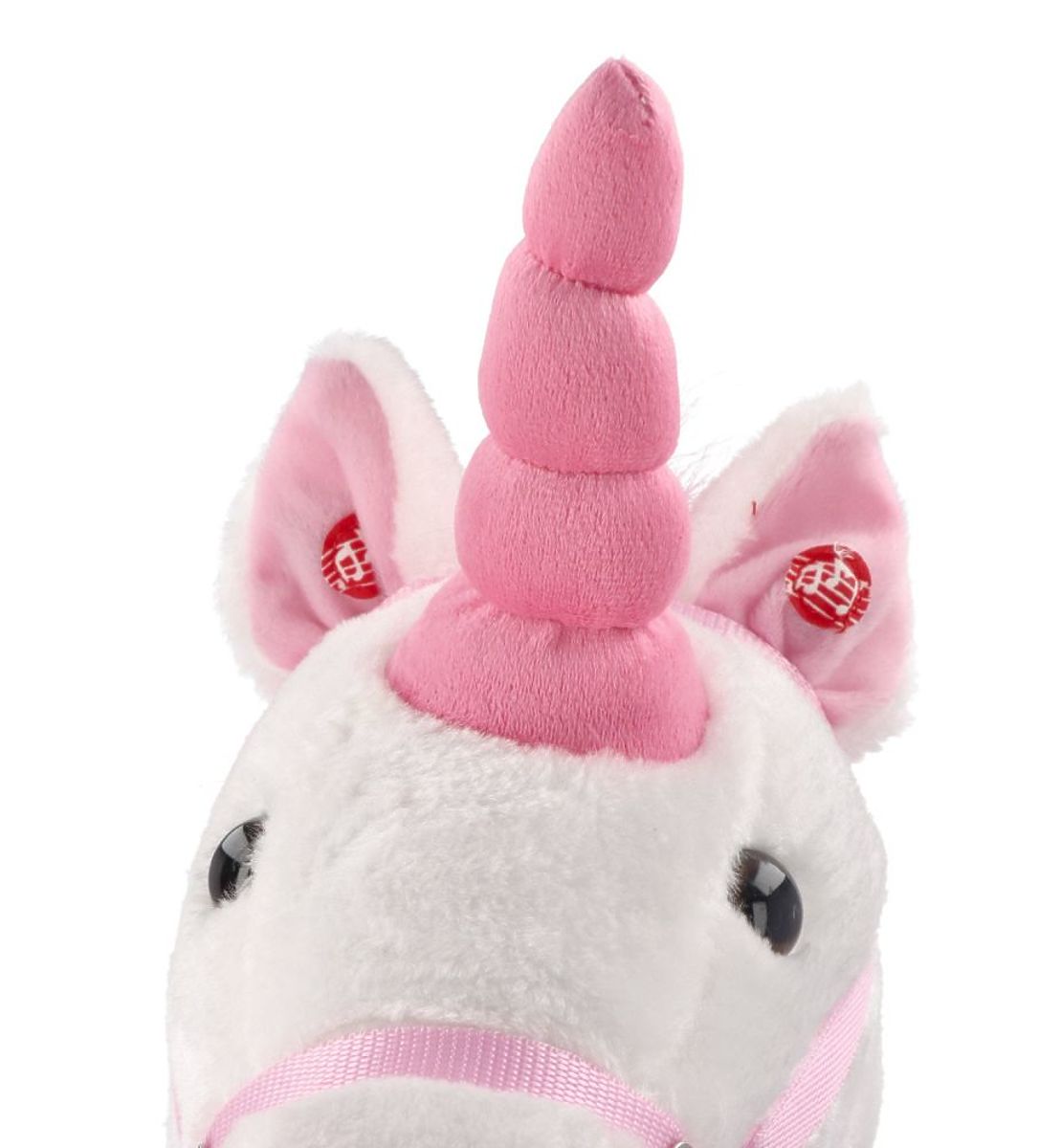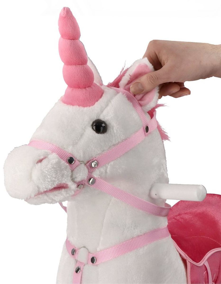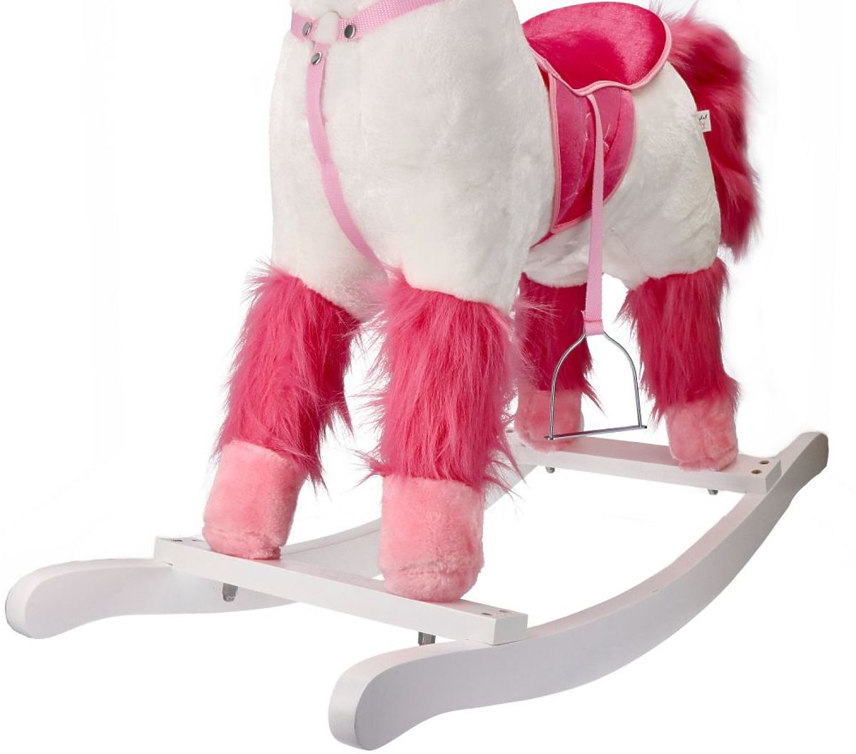 Das Pferd ist aus weichem Plüschmaterial in Weiß gefertigt. Was ihm Charme und Charakter verleiht, sind die rosa Accessoires: Horn, Hufe, Mähne, Schweif und schöne Quasten an den Beinen, typisch für Friesenpferde und natürlich Einhörner;-) Rosa sind auch die Elemente der Reitausrüstung, d.h. Sattel und Zaumzeug. Das Pferd hat weiße, hölzerne Kufen und Griffe.