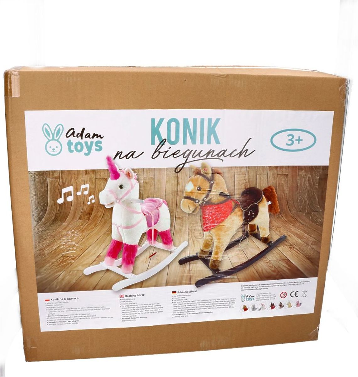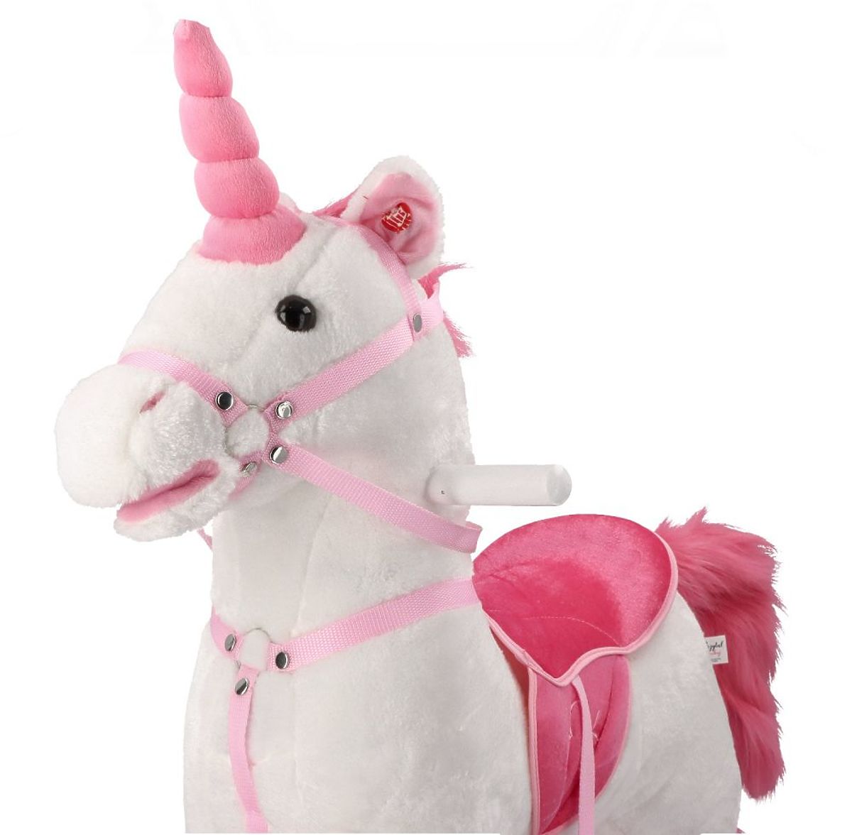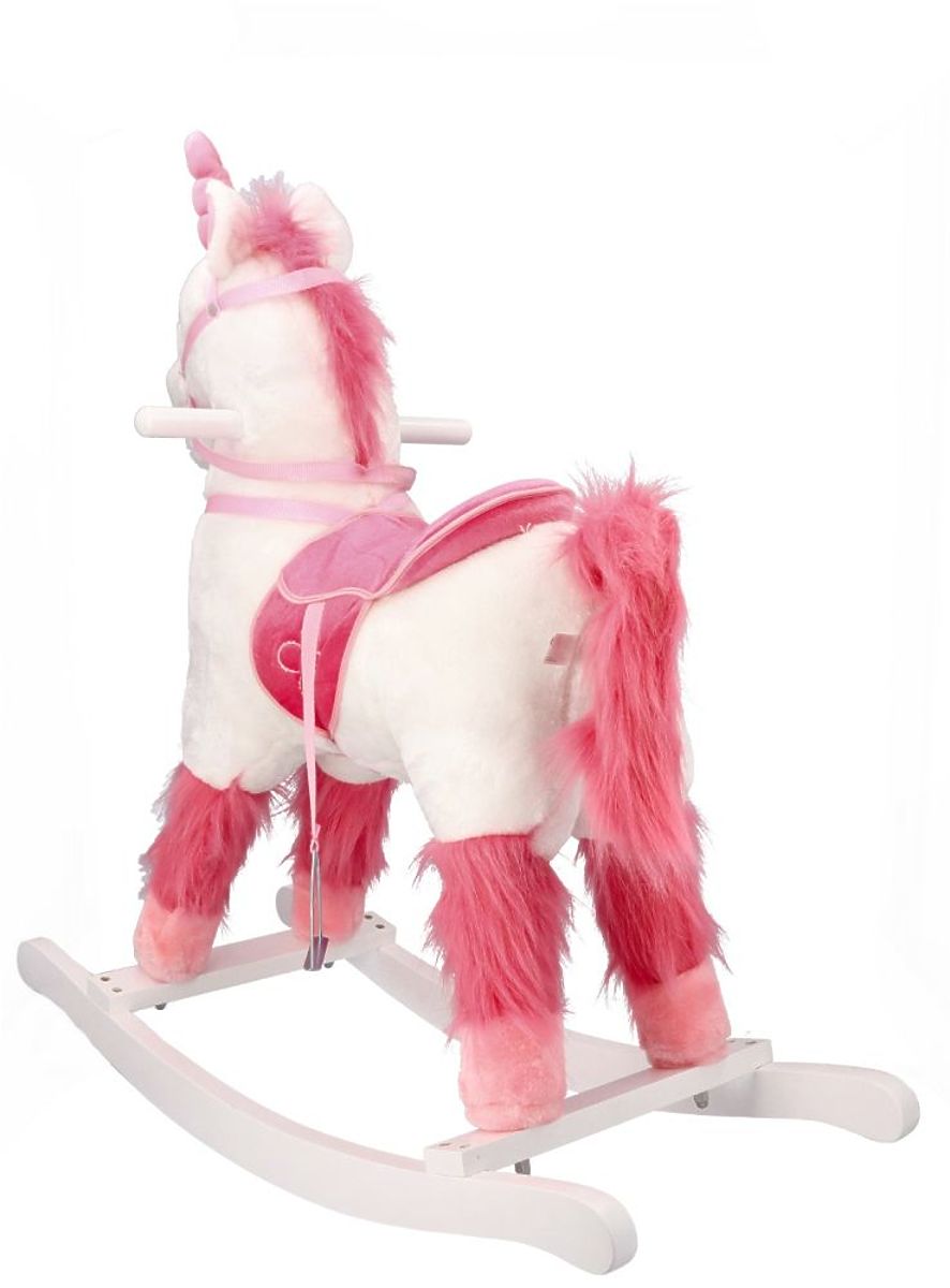 Das Pferd ist aus weichem Plüschmaterial in Weiß gefertigt. Was ihm Charme und Charakter verleiht, sind die rosa Accessoires: Horn, Hufe, Mähne, Schweif und schöne Quasten an den Beinen, typisch für Friesenpferde und natürlich Einhörner;-) Rosa sind auch die Elemente der Reitausrüstung, d.h. Sattel und Zaumzeug. Das Pferd hat weiße, hölzerne Kufen und Griffe.