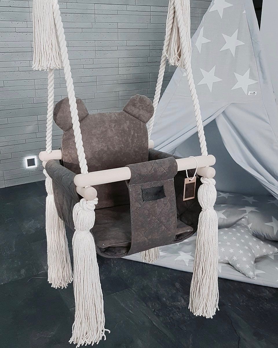 Ein wunderbares Geschenk für jeden Anlass! Die tolle handgenähte Schaukel im Originaldesign begeistert nicht nur Kinder, sondern auch Erwachsene. Die braun-graue Schaukel eignet sich ideal für eine Wohnung .