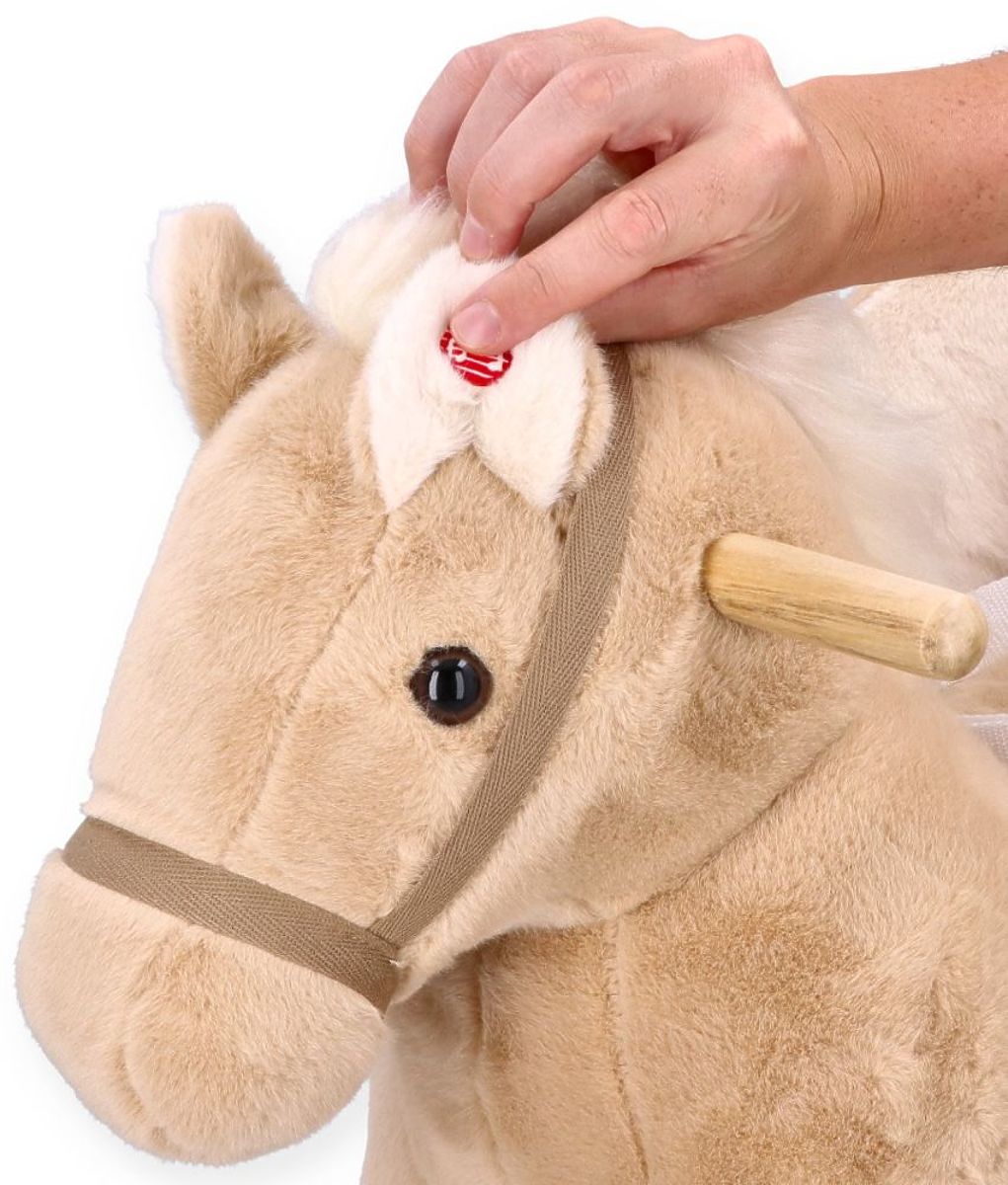 Das Spielzeug benötigt zwei AA-Batterien. Das Batteriefach ist unter dem Bauch des Pferdes versteckt.