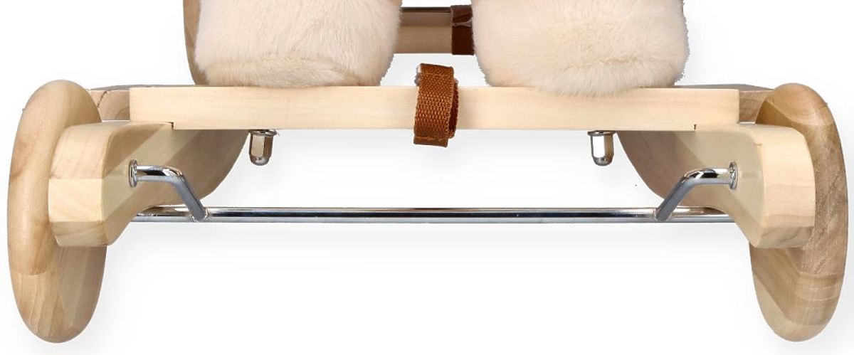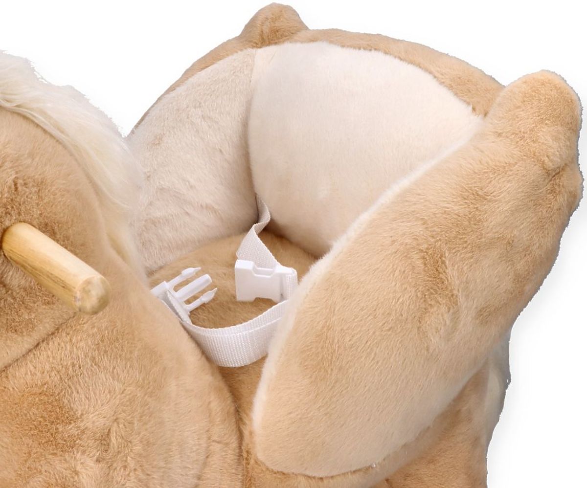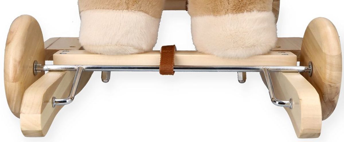Der Pegasus ist aus weichem und angenehm zu berührendem Plüschmaterial in sanftem Beige gefertigt. Die Kufen und Griffe sind aus Holz in natürlicher Farbe, was perfekt zum Gesamtkonzept passt. Unser Plüschfreund hat Holzräder, die es ermöglichen, je nach Anordnung ein Schaukelpferd oder ein Rutschfahrzeug zu sein. Der Wechsel vom Rutschfahrzeug zum Schaukelpferd ist sehr einfach. Es ist nicht nötig, etwas zu demontieren, einfach den speziellen Gurt lösen und die Räder auf die andere Seite der Kufen drehen. Fertig!